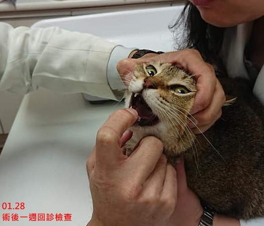 傷口狀況恢復的還不錯,縫線會慢慢被組織吸收掉,如傷口附近變紅或嘴巴有異味出現,則需要回診拆線,若是口腔不會再紅腫,就可以排除口炎問題,一個半月後再追蹤。