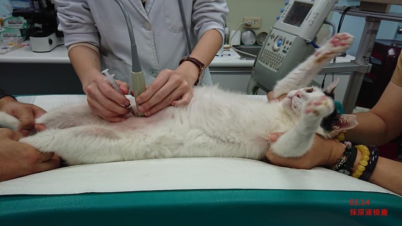 2019年1月工作人員發現抱抱尿尿行為異常,頻繁進出砂盆、久蹲尿少,立即約診沐恩醫院於1月7日進行檢查,醫師安排抱抱照X光,發現骨盆有舊傷跡象,有類似碎骨片物質,但因膀胱被骨頭遮住,無法確定是否有結石,先開口服止痛滴劑、抗生素、利尿通,並囑咐觀察、記錄尿量及持續回診追蹤;1月19日抱抱由泌尿專科武醫師看診,超音波檢查看到很多雜質但無結晶,先前服藥近兩週雖有改善但不夠理想,另因抱抱皮膚多處嚴重紅腫脫毛疑似黴菌,又有濃鼻涕,蘇璧伶醫師親自看診,安排抱抱進行血檢、皮膚及鼻涕採樣,做黴菌、細菌的培養,重新調整抱抱的用藥,使用另種抗生素及施打干擾素,因蘇醫師的病例中,干擾素對部份貓咪的鼻腔問題有顯著效果,希望抱抱也能得到治療效果。