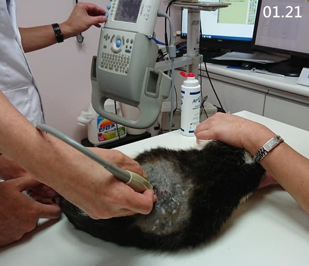 鮮草在照護人員的悉心照顧下,漸漸適應了新環境食慾也越來越好,在1月17日工作人員發現鮮草身上濕濕的、身體左側傷口有膨起、有拉肚子情況,因此約診沐恩醫院進行檢查。