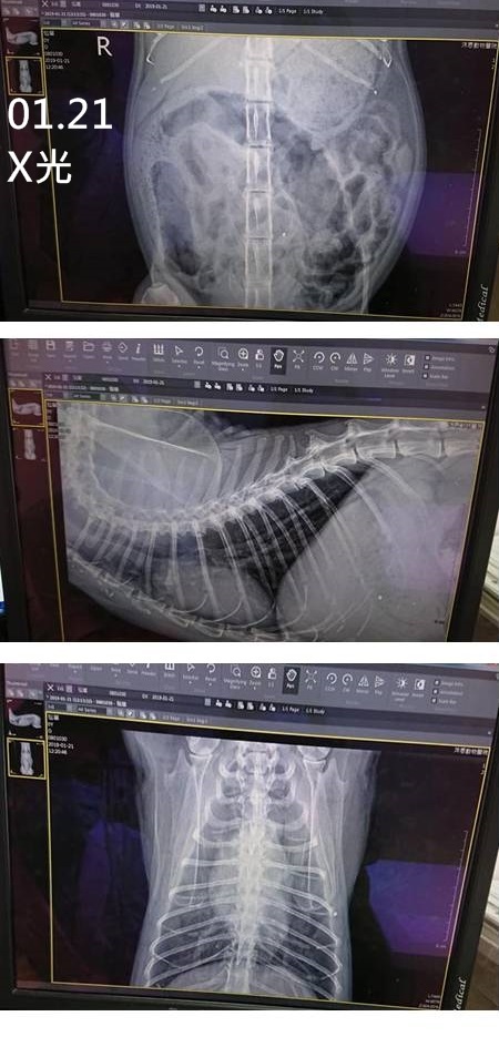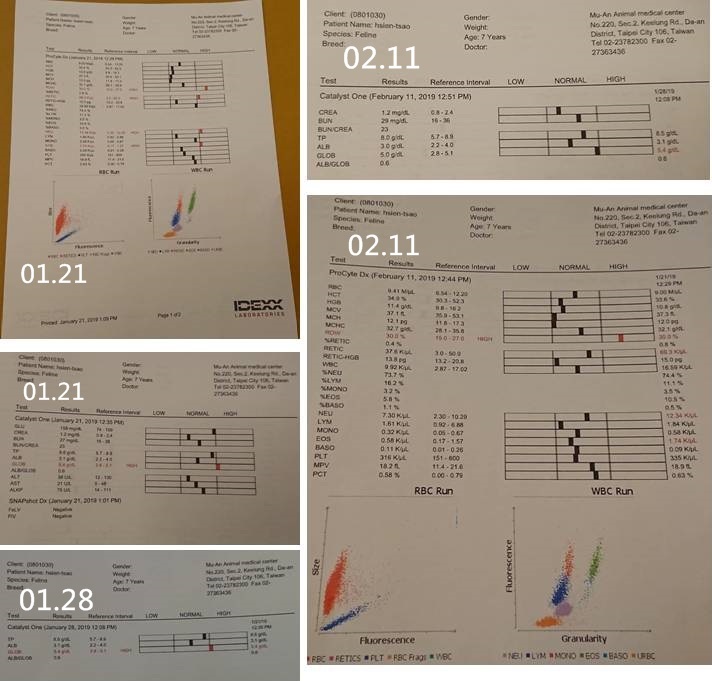 院長林醫師詳細為鮮草做全身觸診、X光、血檢、口腔檢查,發現鮮草心臟輪廓不是很正常、脊椎有退化情況使得動作緩慢、身體左側傷口膨起,可能是因受傷而少一處肌肉,使腸子集中於此處引起的凸出、腸道內空氣很多造成拉肚子、舌頭有潰瘍,讓他無法正常理毛,幸好是血檢部分並沒有太大問題,二合一檢驗為陰性,先以抗生素、益生菌治療調整,並須持續回診追蹤檢查。