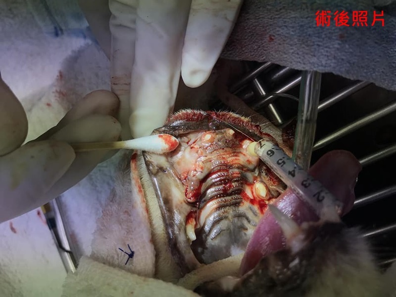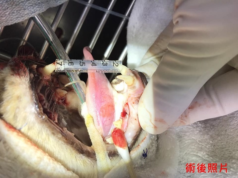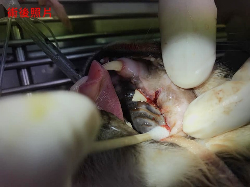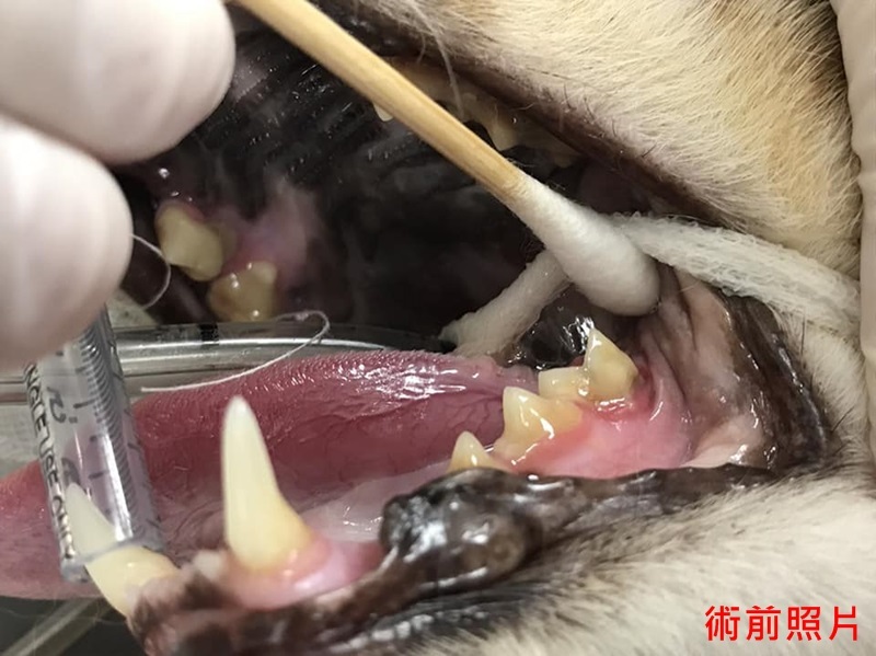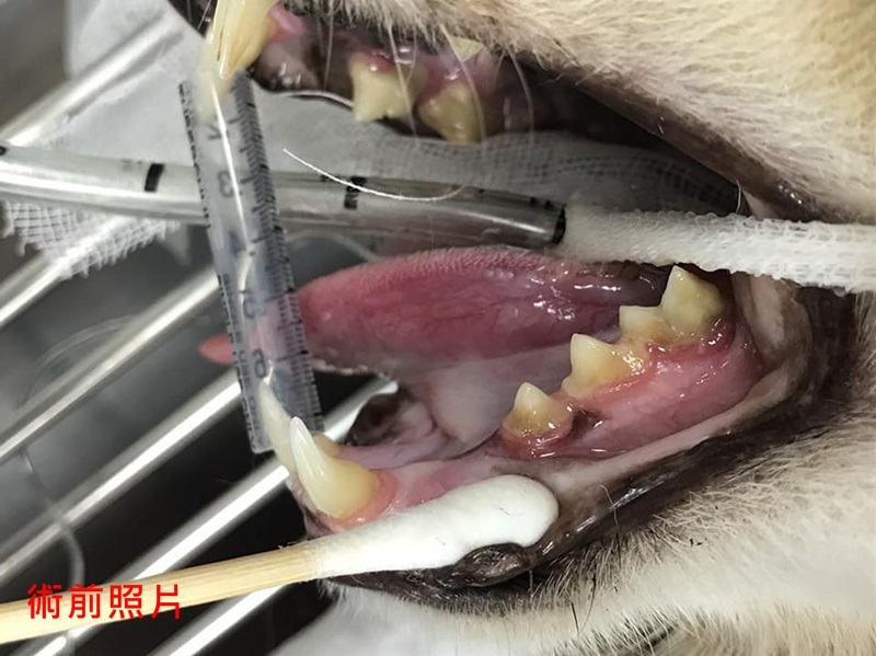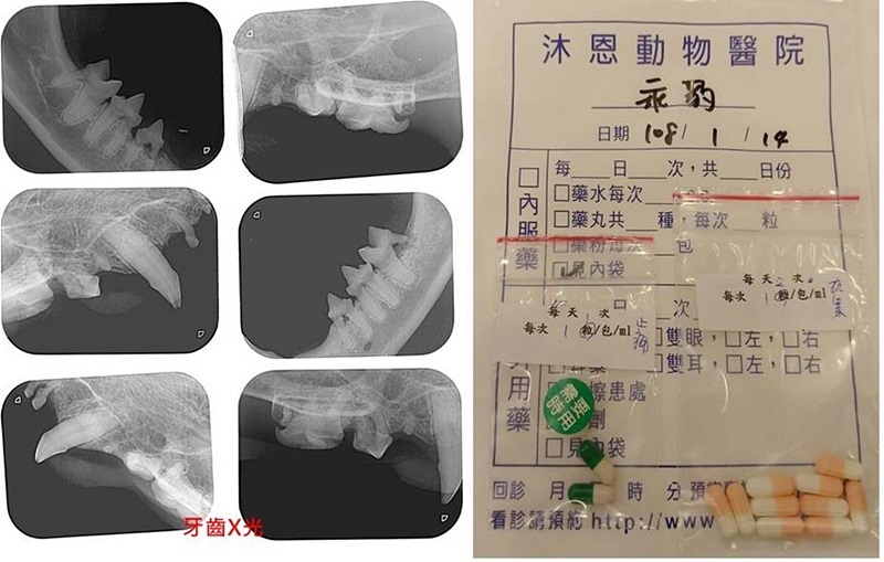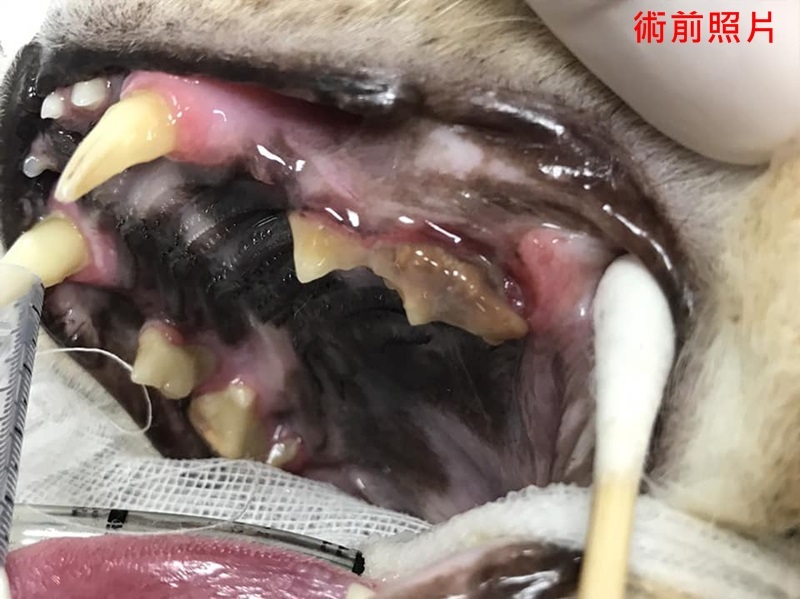 醫師說明乖豹的上排牙齒結石很厚及有數顆牙齒蛀蝕情況嚴重,須進行洗牙與牙周治療。