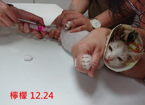 檸檬來自苗栗的一間寺廟,老師父收留很多浪貓,協會得知後,長期提供物資、協助醫療、結紮,但因民眾都會將未結紮貓咪棄養在這裡,使貓咪數量越來越多,台北工作人員前往送物資時,發現有很多狀況不良的小小貓,都有嚴重的皰疹病毒感染,檸檬就是其中一隻,協會工作人員將這些小貓帶回台北配合醫院治療,檸檬不但失溫又營養不良,體重只有200g,緊急醫療後,因需灌食,即帶回安養之家保溫安置,並由照護員輪流灌食。