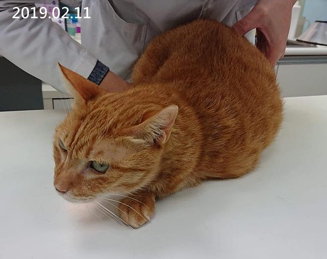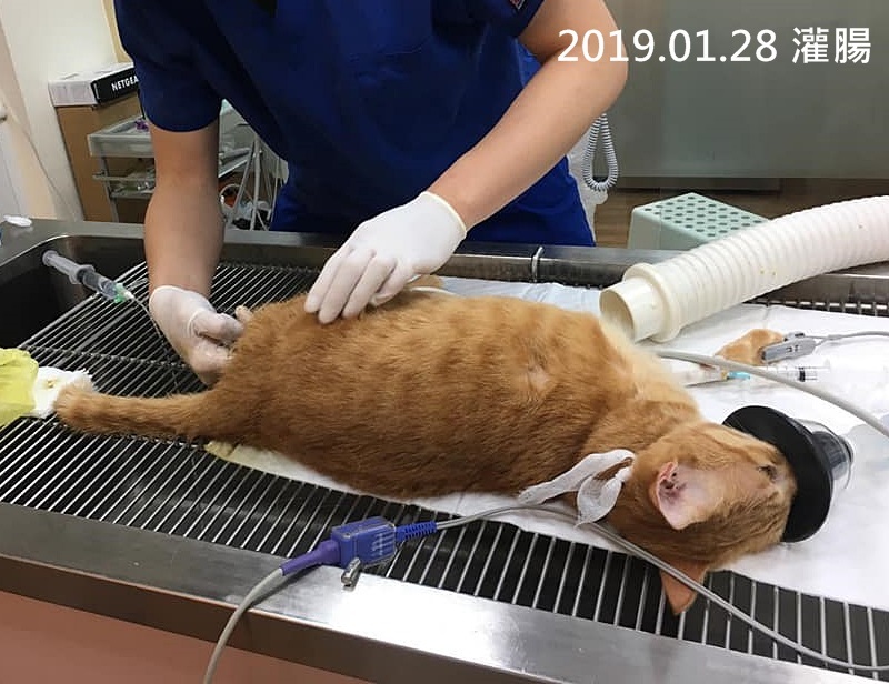 照護員發現早上小黃一直在沙盆裡翹屁股,但仍大不出大便,摸到肛門附近有一塊大便,但無法協助排出,所以至醫院就診,醫師利用ky幫忙把最外部的乾硬大便挖出,仍可觸診到有一截較硬的大變,不過離肛門口還有一段距離,再加上小黃腹部脂肪較厚無法徒手將糞便往後推,所以無法挖出,目前先增加皮下注射液,改為早晚各100cc的乳酸林格,其他照護方式不變,仍是每早晚皆吃軟便劑、3cc杜化液。