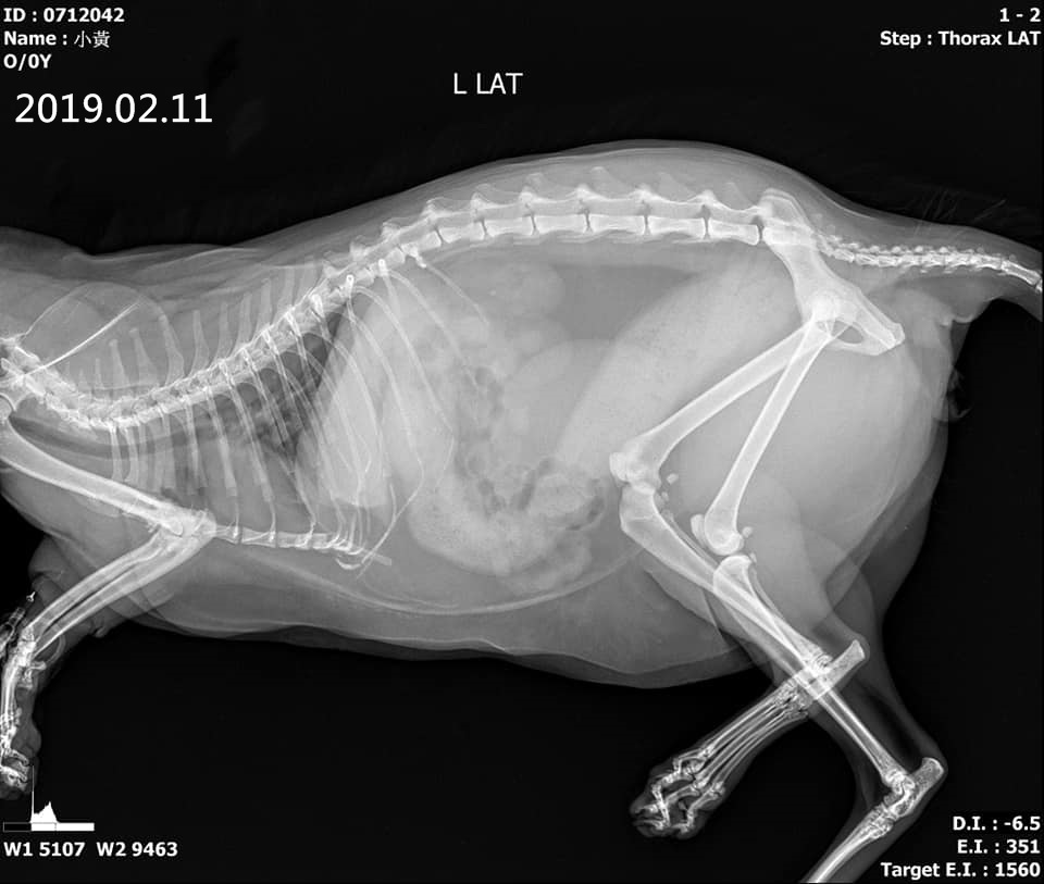 小黃因非常瘦弱,住院觀察了幾天才進行手術將腫瘤取出,但因腫瘤過大,無奈需一併截肢,先前的流浪生活及腫瘤讓小黃的健康情況很不好,腸道結構改變、大腸太粗、有巨結腸,致大便容易累積排不出,所以小黃需要長期吃軟便劑等藥物以幫助排便,並須定期回診追蹤檢查。