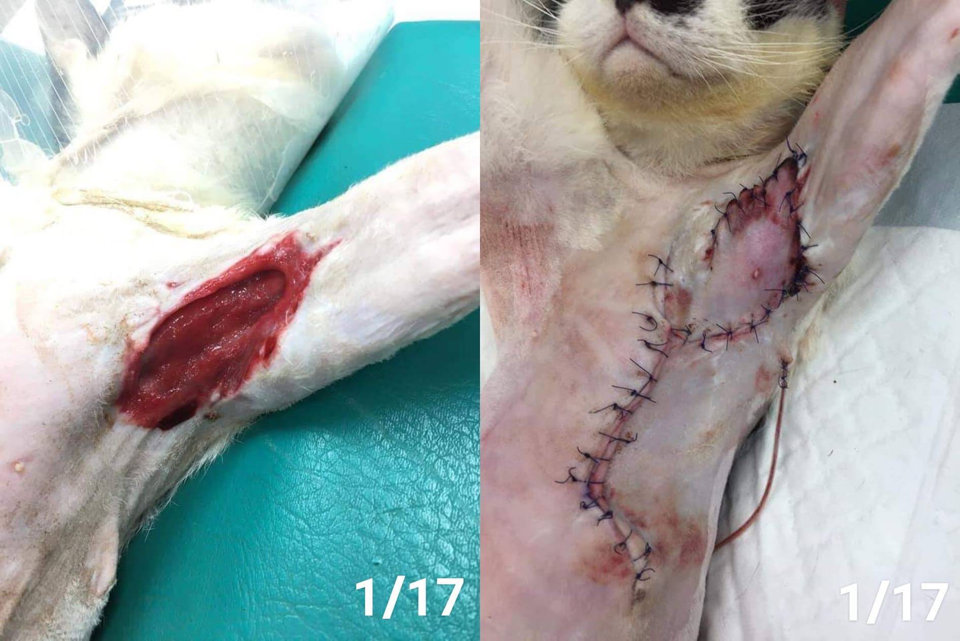 主題: 繩子繞套右肩左腋受傷妙鼻貼黑白公貓 申請者姓名: 許桂菱 花色: 申請日期: 2019-03-05 14:33:06 申請者部落格: 申請者臉書網址: 所在縣市/合作醫院: 台北市/沐恩動物醫院 治療費用: 58000元 需求人數: 120人 已結案 (2024-05-31 18:34:00) 報名人員: Justin(已付款)、Aibby、酷比(已付款)、Yen Lin Chen x4(已付款)、小喵 x2(已付款)、toolong(已付款)、Shelly Lin(已付款)、啊喵喵(已付款)、賴小虎 劉肥肥(已付款)、Becca Huang x2(已付款)、無尾熊 x2(已付款)、連大興(已付款)、瓦莉阿嬤(已付款)、衛生紙(已付款)、Mao Chuan(已付款)、Penny Ou(已付款)、黃琦珊(已付款)、小P x2(已付款)、Jo Chou(已付款)、amberkuyin x2(已付款)、eve(已付款)、黛安(已付款)、Emma(已付款)、Yen Lin Chen x4、黃意嵐(已付款)、舒婷(已付款)、陳湘澐 x2(已付款)、ast*(已付款)、shjuiu(已付款)、流浪兒(已付款)、gill(已付款)、TIN x2(已付款)、Gg(已付款)、林間薰風(已付款)、黛西(已付款)、雲荻(已付款)、陳文文 x2(已付款)、Hsueh Chu-Jing x2(已付款)、小瓜 x2(已付款)、Percy Wu x2(已付款)、JUN(已付款)、Kai Wei Ku(已付款)、陳派佐 x2(已付款)、Anna ho x2(已付款)、江小櫻 x4(已付款)、IZS(已付款)、Freesia Peng(已付款)、吳所謂 x2(已付款)、Yt(已付款)、Ann x2(已付款)、波霸(已付款)、Dexter x2(已付款)、a_chen_huang、Holly x2(已付款)、shihyi(已付款)、philtery x4(已付款)、sunny chuang(已付款)、米薇安(已付款)、湘楚(已付款)、Noellia、Lee Albert(已付款)、Angel Lin(已付款)、Peggy(已付款)、平(已付款)、liumon(已付款)、Chou Lara(已付款)、萱萱 x2(已付款)、阿駿 x2(已付款)、劉怡屏(已付款)、阿池 x3(已付款)、Nanako(已付款)、思(已付款)、S(已付款)、仲希妍(已付款)、阿芝(已付款)、tetsuyu x4(已付款)、Ray0322 x5(已付款)、K.J. Tzeng(已付款)、Moon x2(已付款)、PEOPLE(已付款)、簡伊伊(已付款)、loveme0501(已付款)、Peace x2(已付款)、小珍 x2(已付款)、 候補人員: 動物病情說明: 傷貓於原本鹿港合作醫院治療癒合狀況不佳,時好時壞,於2019/1/10轉診至台北沐恩醫院,傷口因發炎狀況不適合立即縫合,先做清創及血檢並進行細菌培養!
