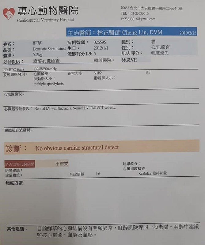 醫師診斷鮮草的心臟,在沐恩提供的X光片下看起來比較低垂,是因為隨著年紀,血管慢慢會越來越鬆弛,屬於正常現象,也沒有發現其他問題,大小也在正常範圍下,估計他已有8-10歲的高齡,若需要麻醉的話,心臟目前狀況是可以的,但因年齡較高,麻醉還是需特別謹慎。
