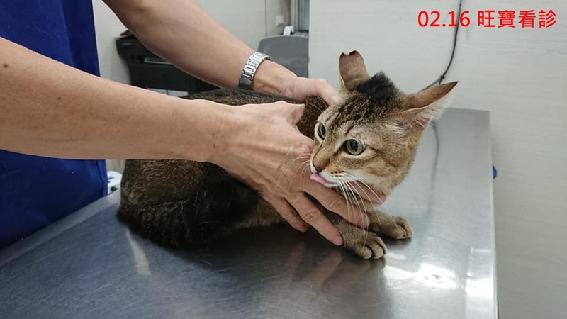 2019年2月間,照護員發現旺寶近肛門處有個較深的傷口,經回報後即安排至醫院檢查,發現旺寶的肛門囊破裂了,將囊液排出後,須再吃藥控制及注射抗生素防止感染,也須戴上頭套防止旺寶去舔傷口。