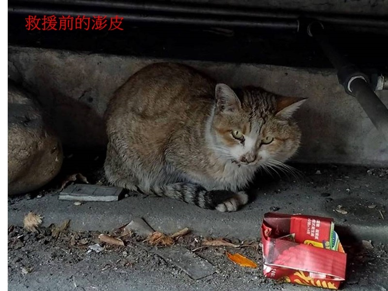 志工們擔心澎皮的情況,接連兩日前往尋找、趴在地上查看車底、拜託車主開引擎蓋查看,為了救援澎皮費盡心思,幸好車主也熱心的幫忙查看,確認貓咪不在引擎附近後再發動車輛,讓躲在車輪與引擎下方凹槽的貓出來,澎皮當時緊張逃跑,多虧tnr經驗豐富的志工們動作非常迅速,終於以網子捕捉到了澎皮並立即送往24小時的醫院檢查。