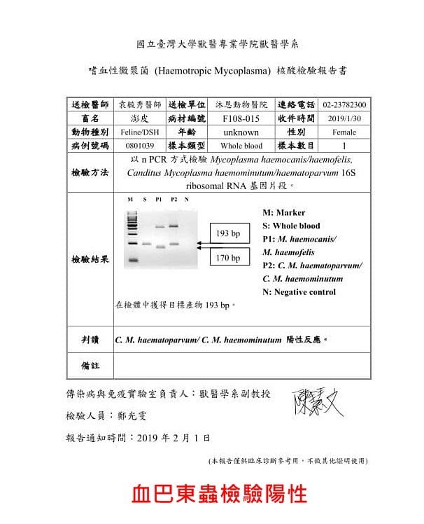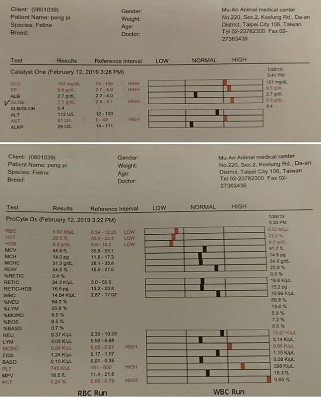血檢結果,雖然還是貧血跟球蛋白高,但較上次有進步,也因為體重有增加,所以排除消化道的問題,應還是血巴東的影響。血巴東的治療期還有三到四週的時間,所以繼續吃藥即可。
