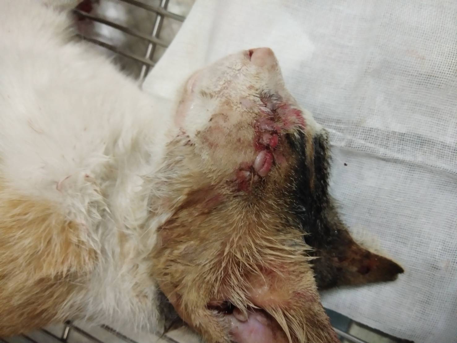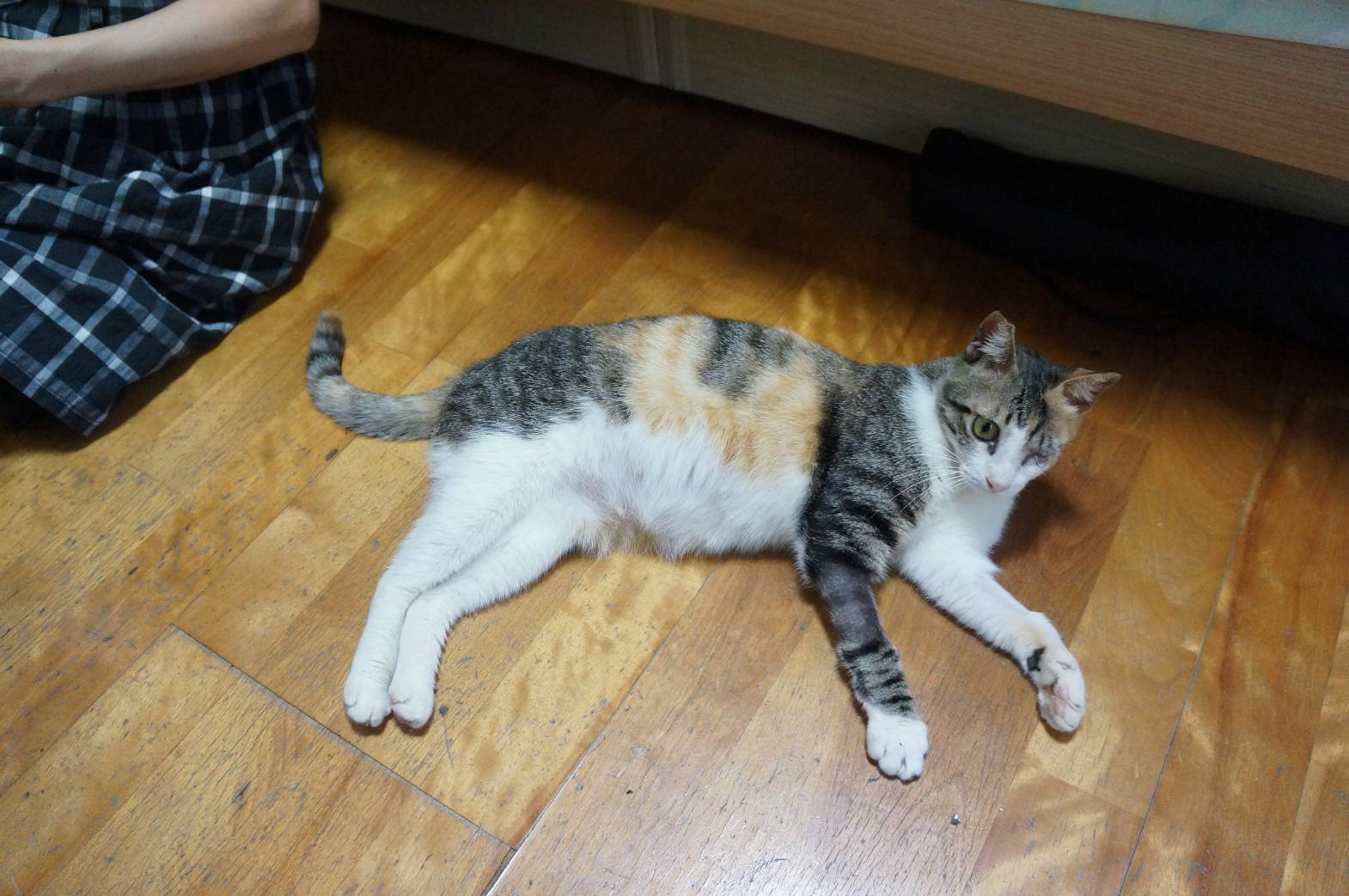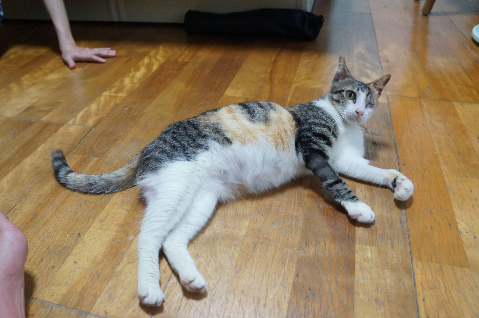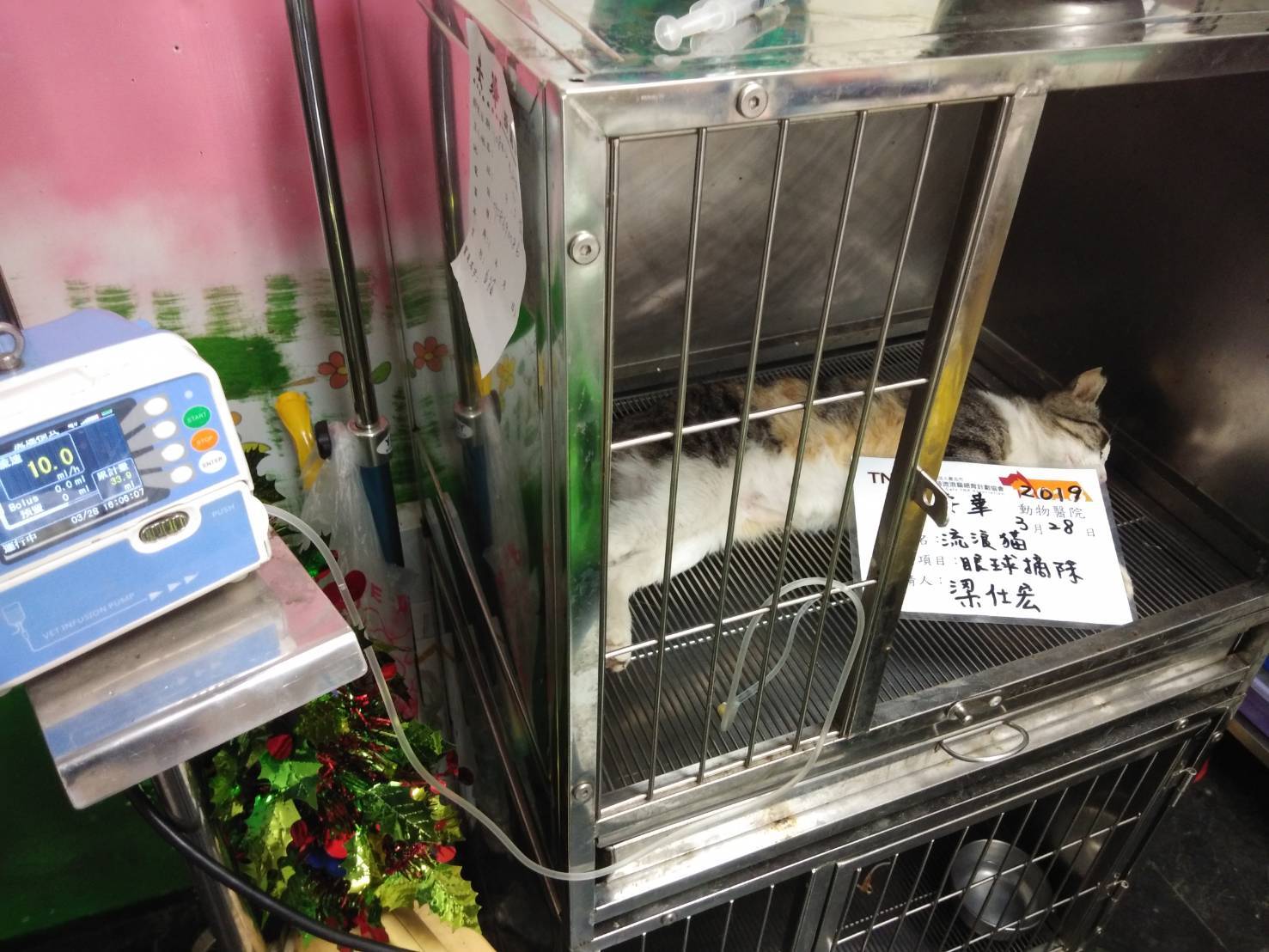 結果前兩天協助王小姐餵食的輔英科大學生小筑去餵食時,她依然很親人的跑出來迎接,但是小筑立刻就發現她因為眼睛感染眼球爆開了,於是她立刻通知我和王小姐去處理,剛開始打算用誘捕籠誘捕,不過她好像感染到嗅覺也不靈敏,所以不走近誘捕籠,於是我們改採用從背後直接抱進籠,幸好她是真的乖,所以也順利抱進籠讓我們能送醫治療。動物近況說明: 我在我所屬的貓貓line群祖上分享小乖乖的遭遇,希望群組的貓友可以幫忙分享給他們的親友,看有沒有幫她找到願意收養她的家庭。所幸的是,前年有在我們群組認養貓咪的貓友恰好也在考慮認養再一隻貓咪互相陪伴,很疼惜小乖乖的遭遇,於是在她住院期間來探視。而小乖乖也一如往常的親人,讓新主人也非常疼愛,所以在她治療完成後,就接她回家,而她也非常快的融入新的家庭生活,和舊貓也相處融洽,找到屬於她的幸福了。