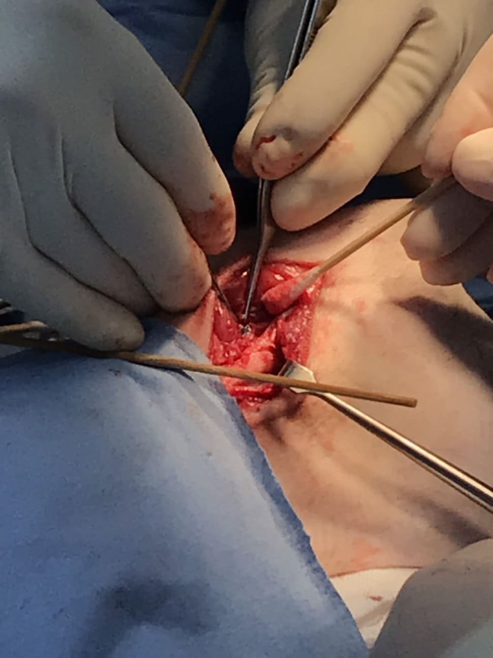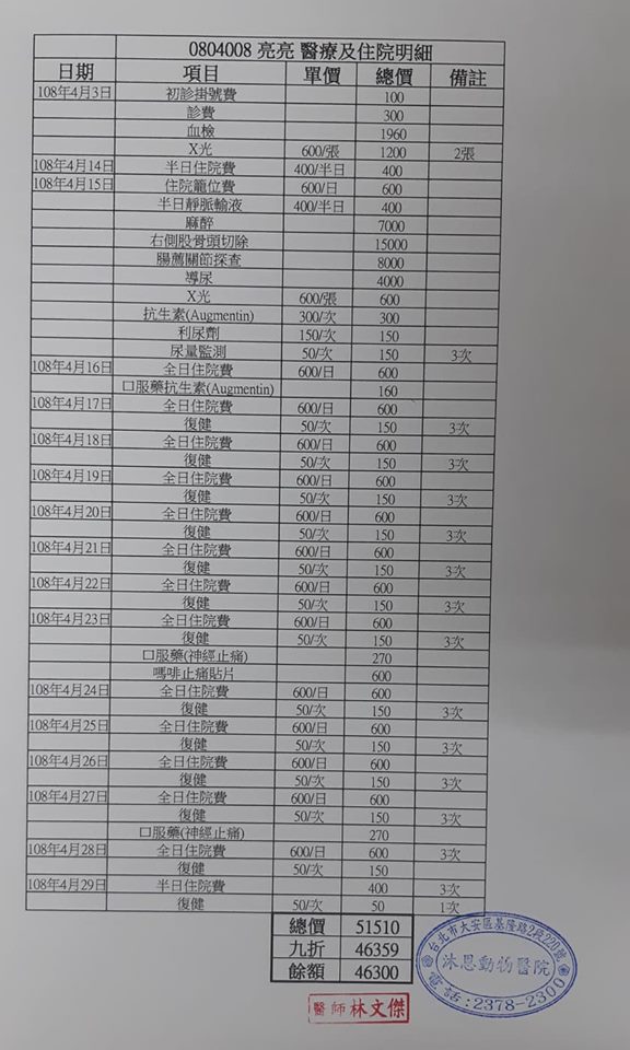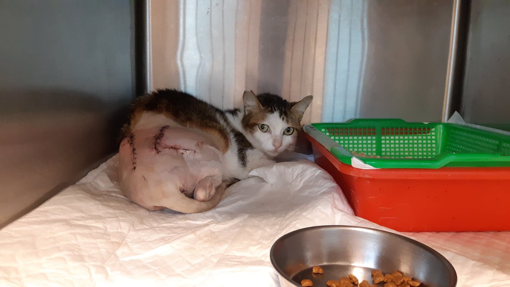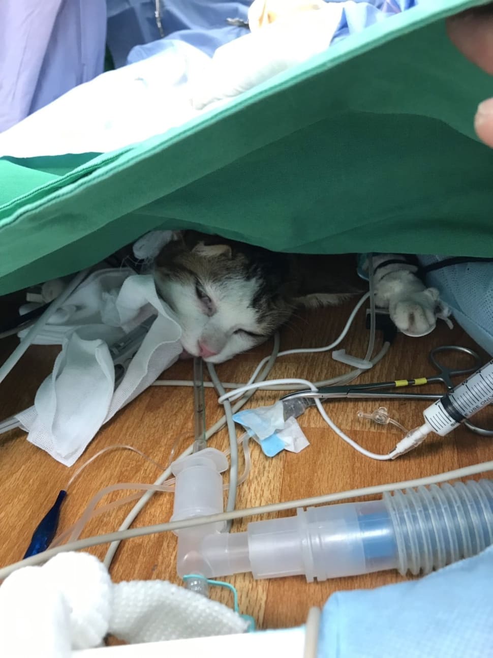 4/3 轉到協會配合的沐恩醫院評估檢查, 安排4/15動手術。靠近腹腔的腸薦骨骼受撞擊位移,但受傷已超過數周內部沾黏嚴重,甚至看不到坐骨神經, 考量周邊血管神經眾多, 硬是拉扯可能造成癱瘓, 故腰間手術無法施行。後遺症是貓咪終身會覺得疼痛, 後半部會壓低身體走路,比較不像正常貓咪直立。