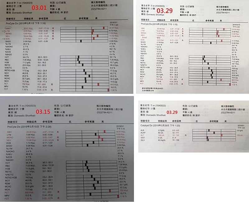 本次血檢白血球指數等比3/15時較差一些,但肝指數較好一些,且體重有大幅增加,所以醫師認為該數據是可以接受的,加上近期食慾排便都不錯,所以改為一個月後回診 。