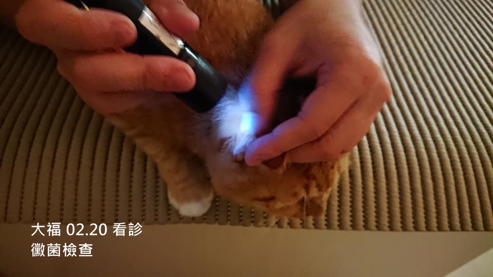 腿上黴菌感染部位,範圍有縮小,也開始長毛了,看診時發現大福耳朵上有幾處脫毛現象,不過在伍氏燈照射檢測後耳朵以及身體其他部位則未呈現螢光綠感染反應。