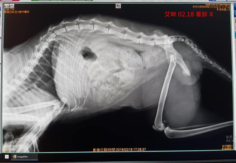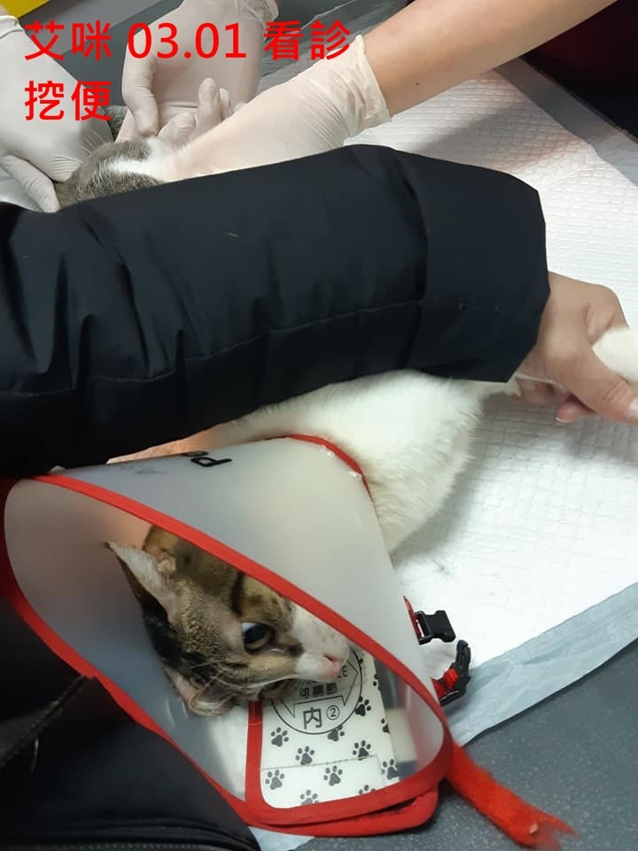 2月18日艾咪至亞太醫院由葉力森教授為艾咪看診,在觸診、直腸檢查、X光檢查後發現艾咪仍有些偏硬的積便,因此鎮定後進行積便移除。過程中再仔細檢查愛咪骨盆口徑正常並無增生組織,葉教授說明,艾咪可能是過年期間一些環境問題、或是本身生理不穩定導至的不適,只要把腸道調養好、增加活動量,應即可改善,術後仍須密切回診檢查一段時間。