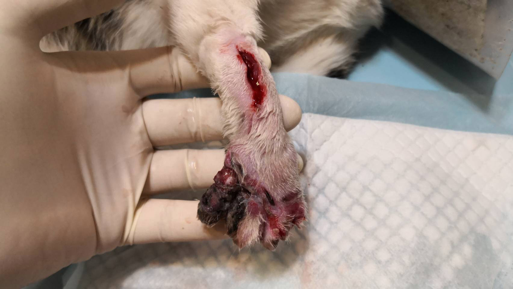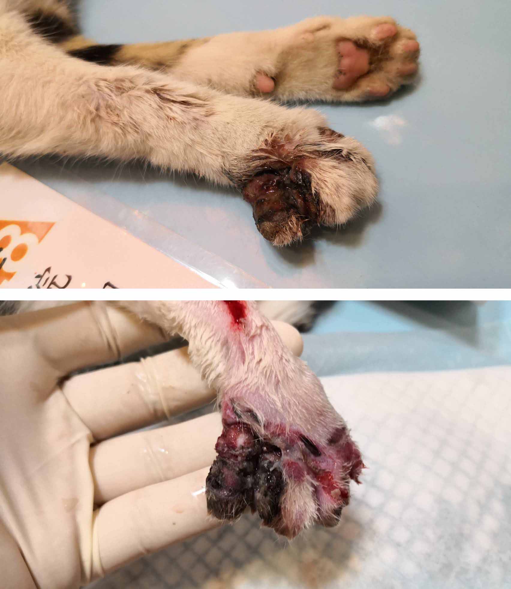 而醫師有點懷疑是遭受到捕獸夾夾傷,有一段是很明顯的壞死潰爛,手臂上又有一個切割的傷口,感覺是尖銳的東西割傷,所以才懷疑是捕獸夾?動物近況說明: 仔仔目前肢腳掌潰爛,右前肢第四、第五指骨最嚴重,前臂的部位有一道很深的撕裂傷,可能要截肢,目前醫師先清創傷口給要控制感染,看能不能保住腳掌,如果順利的話希望之後比較嚴重的那兩指壞死截掉,剩下的腳掌能夠保留下來,這樣至少整隻腳還可以使用,不會變成三腳貓,但還是要看看後續的感染情況有沒有辦法控制住,如果繼續嚴重的話還是要截肢。