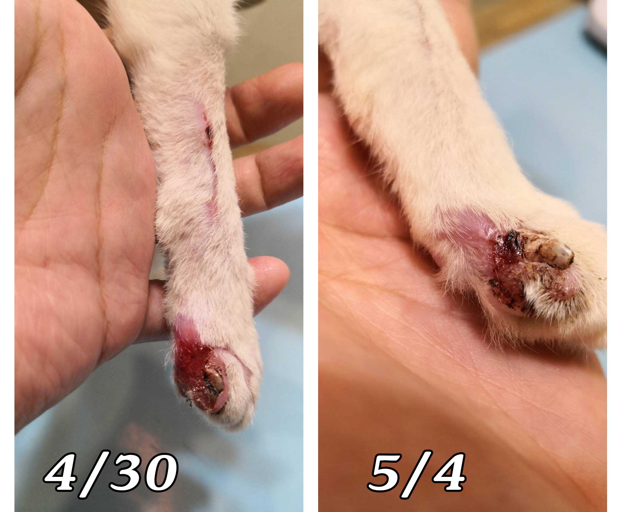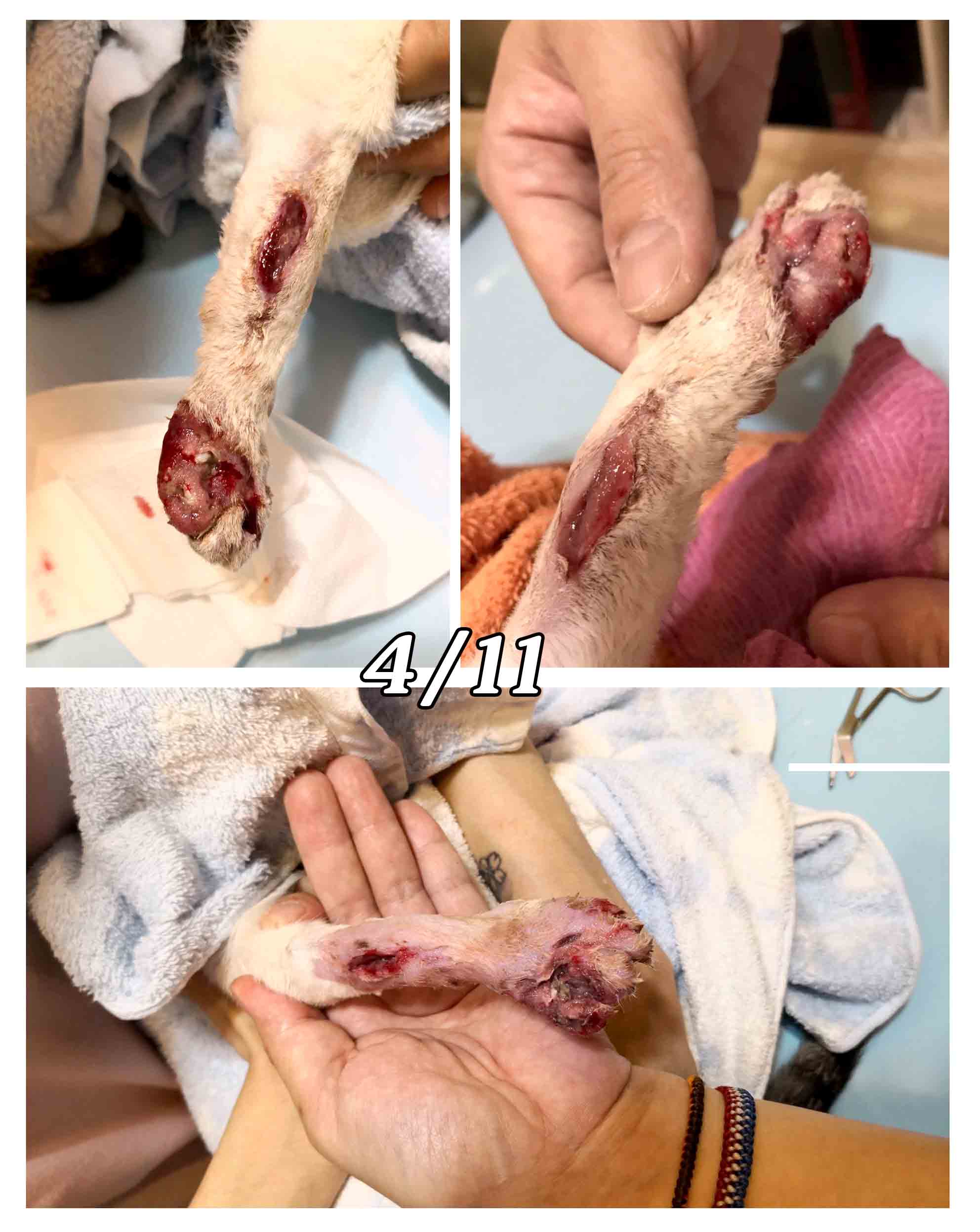 我帶著工具趕快衝去,巷子的街燈讓我清楚的看見仔仔的左腳掌彎曲且鮮紅,不知道這幾天他到底經歷了甚麼,他變得警戒!耗了一個多小時才將他誘捕到,看著仔仔的腳掌聽著牠的哀嚎心疼不已,一早立刻帶去醫院。