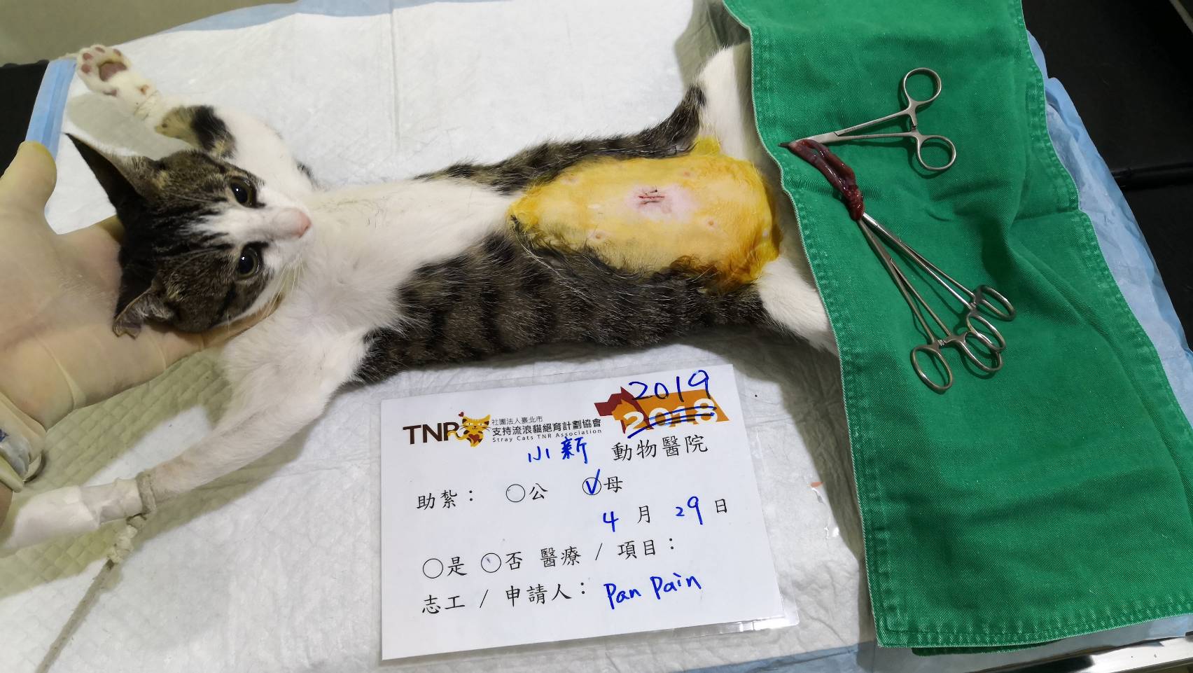住院期間仔仔都很乖,也因醫生跟助理的呵護下沒有這麼緊張,食慾與心情都保持在最好的狀態,讓傷口也好得很快,此外感染也控制住了,確定已經無須截肢,只要保持下去等傷口痊癒就可以出院了,於是醫生在4/29幫仔仔做了結紮手術,但出院當天仔仔傷口還有一點點尚未癒合,避免原放後再度感染,因此先帶回安置直到傷口癒合再原放。