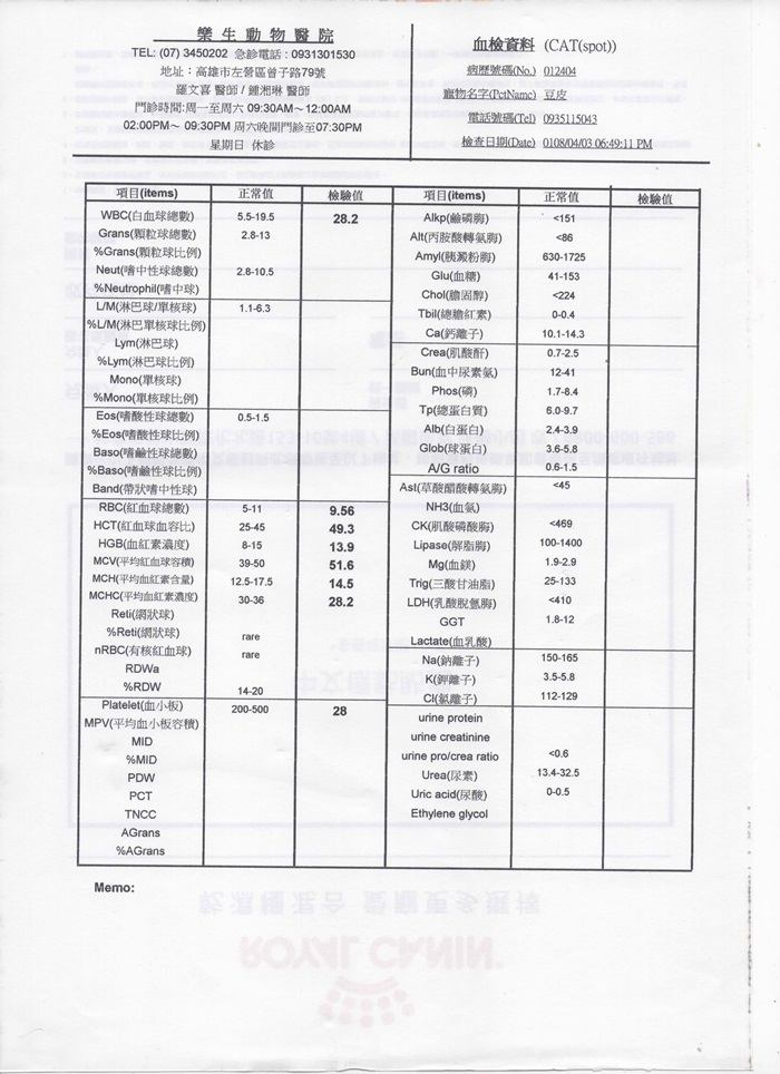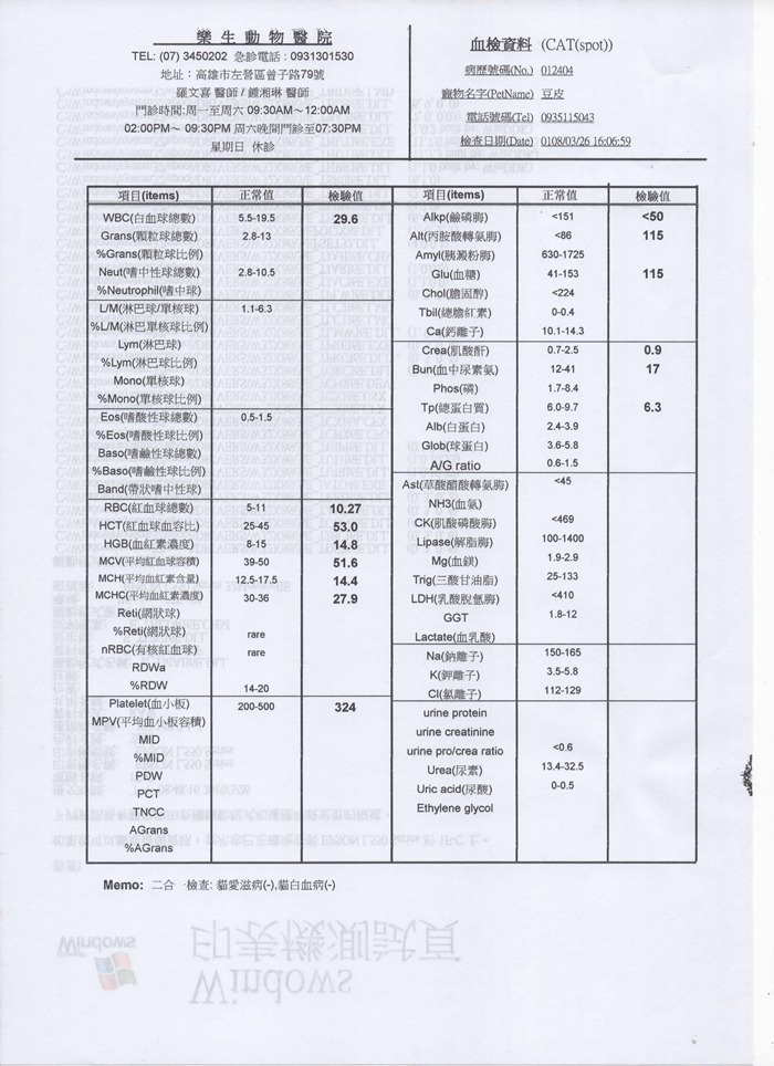 血檢白血球過高,並有脫水現象,到院時狀況較好, 會自己吃,所以並未上點滴,僅初步給予藥物治療,觀察狀況還不錯,食慾很好.動物近況說明: 目前治療觀察狀況穩定, 已出院, 目前由協會台北接手送養喔^^