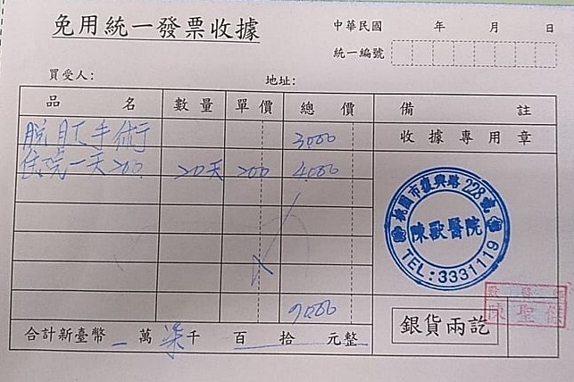 脫肛手術3,000元 住院一天200元,住院20天4,000元。 總計7,000元