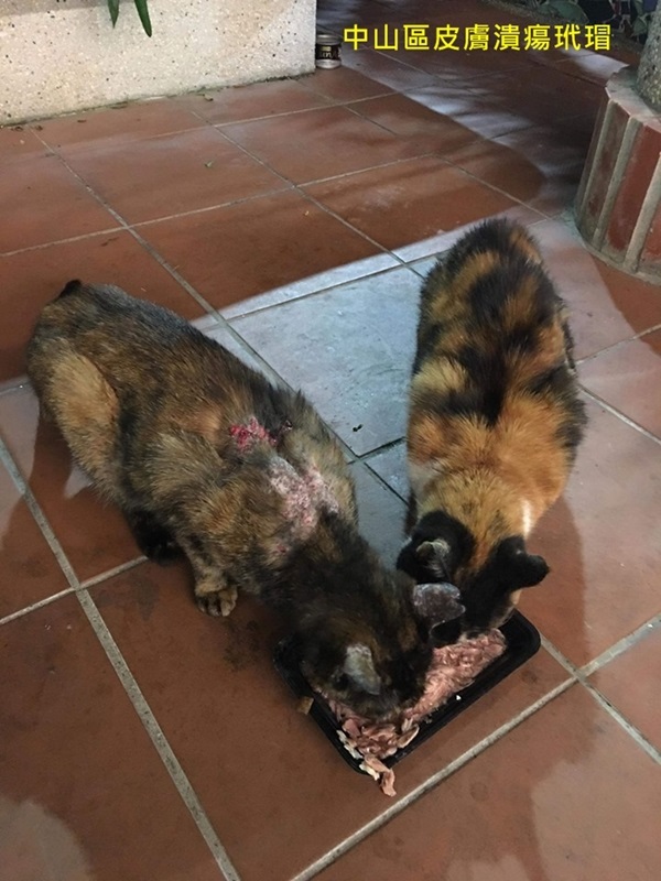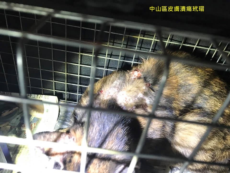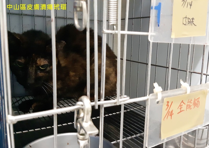 協會志工接獲通報,民眾餵養的一隻玳瑁貓咪,背上皮膚有不小的傷口、還有大片脫毛,志工於3月14日前往架設誘捕籠捕捉到,即刻送往醫院檢查,醫師將貓咪留下住院以抗生素治療,因為貓咪沒有剪耳、餵養者也不確定貓咪是否有節育,因此於3月15日開腹探測,確定貓咪已無子宮卵巢,便補剪耳標記,貓咪住院至3月28日狀況已穩定,便辦理出院帶回原地由餵養者持續餵養觀察。