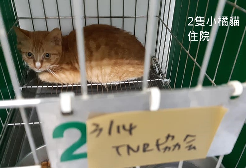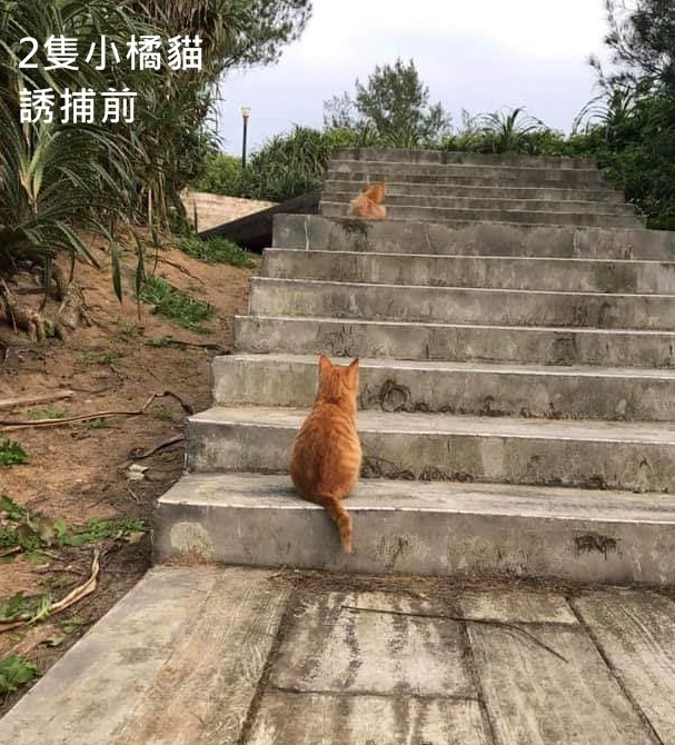 3月14日工作人員前往海水浴場執行任務時看到兩隻橘子小貓咪,在階梯上的背影好可愛但又讓人好心疼,架設誘捕籠捕捉到後,先送往醫院住院觀察,出院後先帶回協會安置,本希望為兩隻貓咪找家,但因他們太過於緊張,擔心造成壓力影響健康,因此無奈將他們帶回熟悉的原生地,幸好原生地有人每日餵養照顧,希望兩隻小貓能夠一直健康平安。