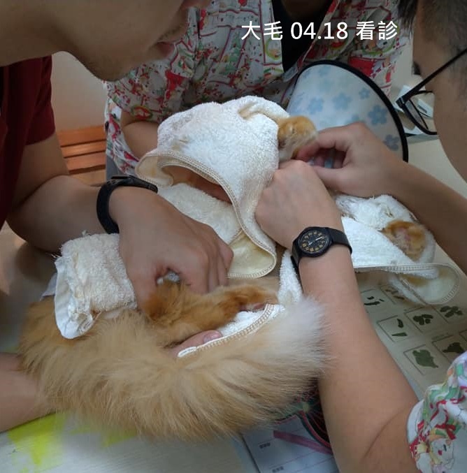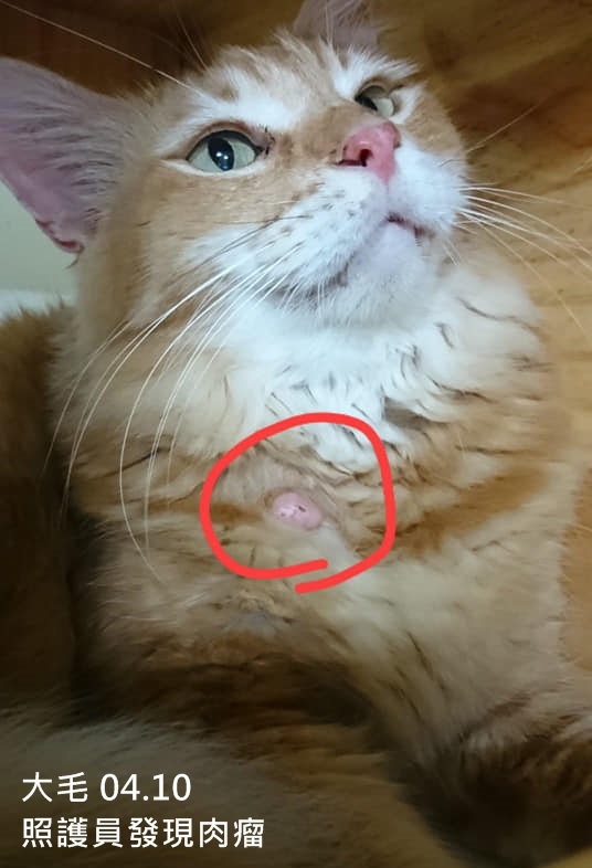 今年4月10日大湖的照護員發現大毛的脖子下方有顆肉瘤,便安排至台北的極光動物醫院請腫瘤專科醫師檢查,醫師進行採樣檢查,幸好結果是良性瘤,便再安排將大毛送回大湖安養之家。