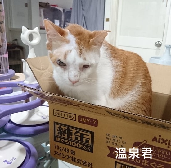 溫泉君是被貓友從臭水溝中救起的可憐小貓,當時他的頭皮疑似被狗咬傷,破了很大一個洞,整塊頭皮不見,志工緊急將他送醫檢查治療,醫生先為他進行整形縫合手術,術後在醫院住院了很長一段時間,取名的由來是因為溫泉君的頭上總是包了一個敷料紗布,又眼睛因為天生眼瞼畸形影響呈現半睜著眼狀態,這模樣像極了正在泡溫泉享受的小老頭,因而被醫生取名為溫泉君。