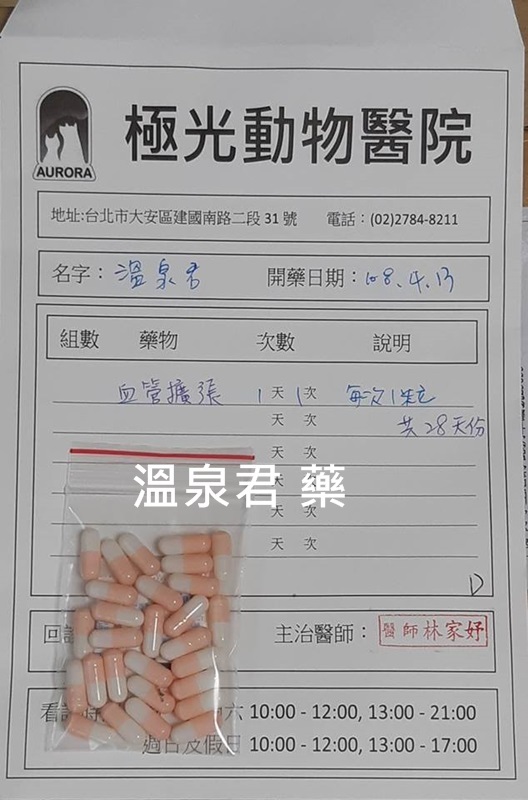 溫泉君的心臟疾病,須要定期至心臟專科檢查進行心臟超音波、血壓監測,持續服用心臟病藥物控制,所以每個月都要至醫院取藥,本筆醫助為4月16日至極光醫院取一個月份用藥的費用,希望大家一起幫忙可愛的溫泉君,謝謝大家。
