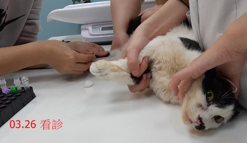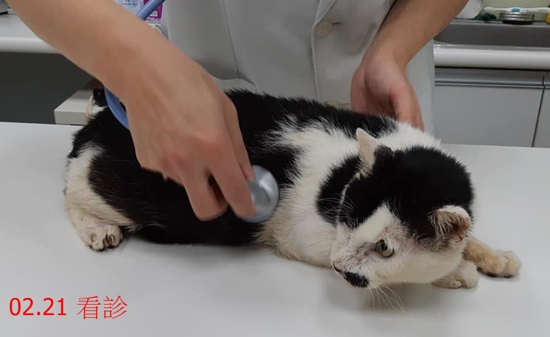 鮮草因流浪覓食不易加上受傷一段時日,更使得健康情況不穩定,協會安排他至沐恩醫院做X光、血檢、口腔檢查,醫師發現鮮草心臟輪廓不是很正常、脊椎有退化情況使得動作緩慢、身體左側傷口膨起,可能是因受傷而少一處肌肉,使腸子集中於此處引起的凸出、腸道內空氣很多造成拉肚子、舌頭有潰瘍,讓他無法正常理毛、口水多,幸好是血檢部分並沒有太大問題,二合一檢驗為陰性,先以抗生素、益生菌治療調整,並須持續回診追蹤檢查。
