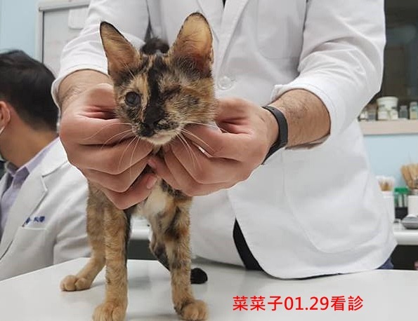 協會再帶菜菜子至醫院做更詳細的檢查,醫師說菜菜子除了眼睛問題及體重較輕之外,其餘狀況都還不錯,因右眼似乎仍有視力,醫師建議每天勤點藥水人工淚液,一段時間後,原本被眼瞼遮住的眼球漸漸露出了,她也似乎更看得更清楚,於是再帶至眼睛專科遠見動物醫院看診,希望可以讓菜菜子的視力恢復更多,醫師認為菜菜子的左眼已萎縮應無法再恢復,但右眼的神經沒有問題,每日多次點眼藥水及人工淚液,可以幫助她恢復得更好,隨著她長大再做檢查調整用藥。