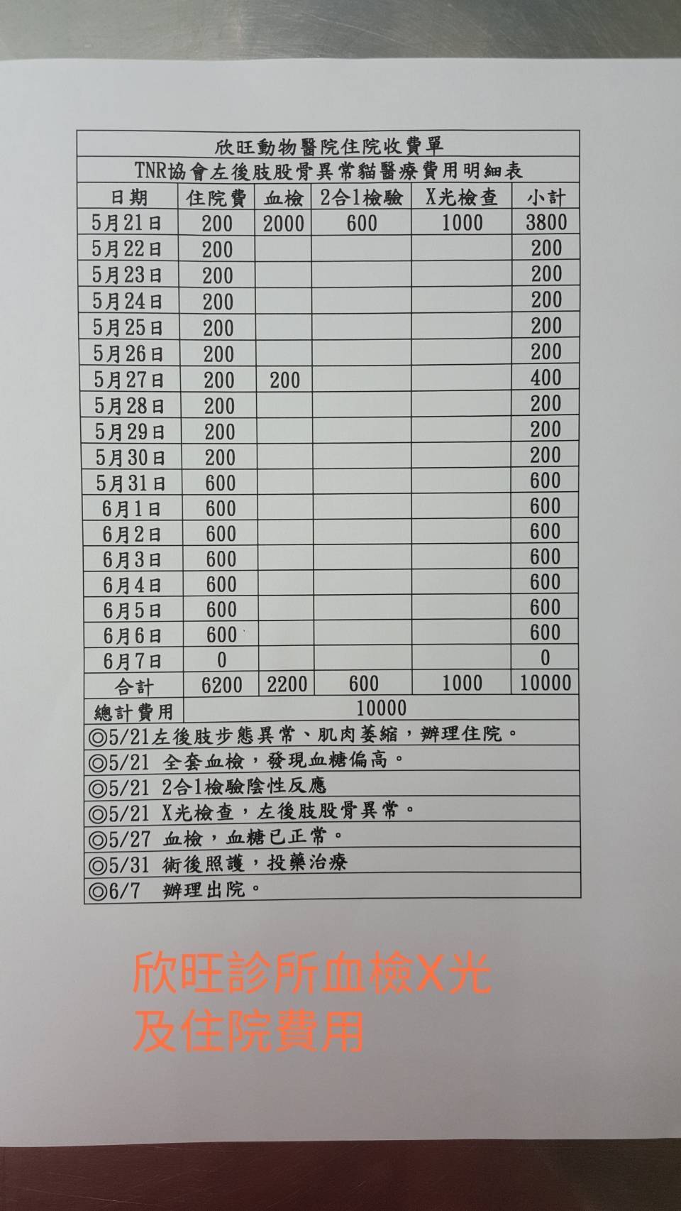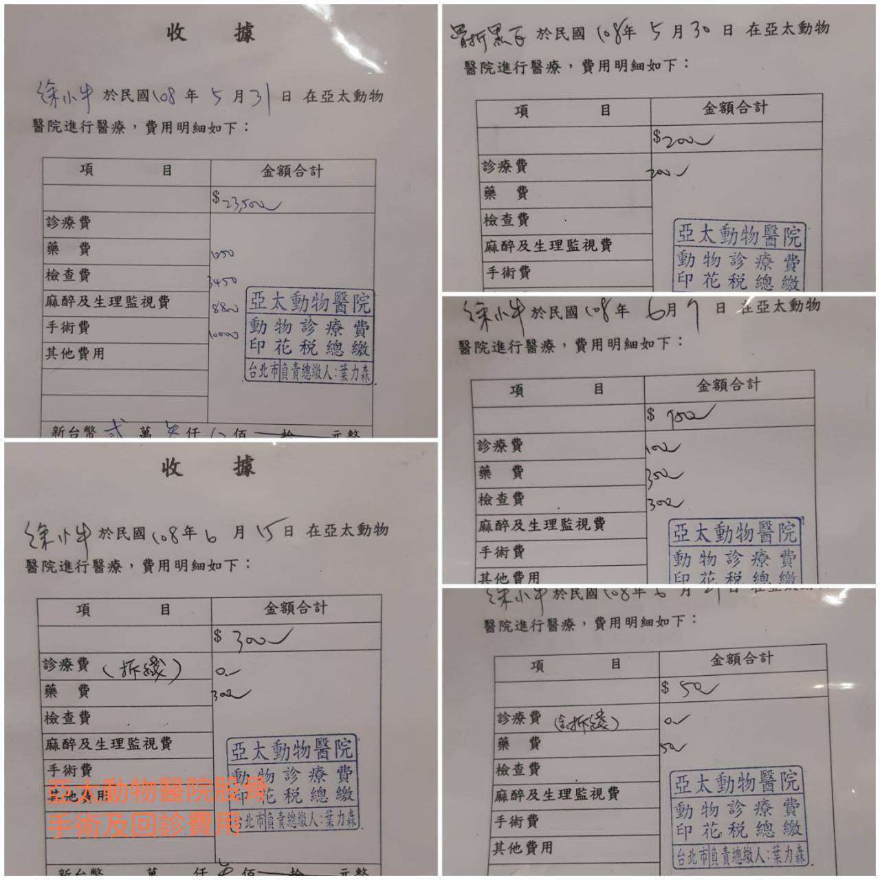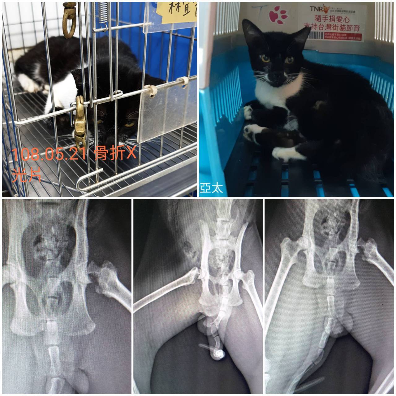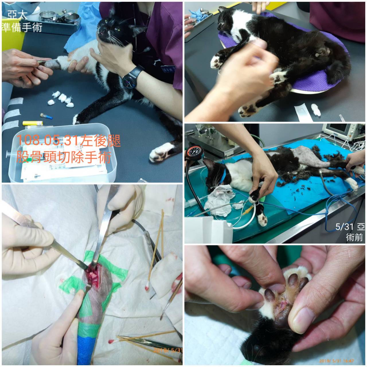 5/31 亞太動物醫院進行股骨頭切除手術。手術進行順利但小貓有感冒感染症狀,醫囑後續送回欣旺診所以抗生素繼續诒療並加強營養攝取。