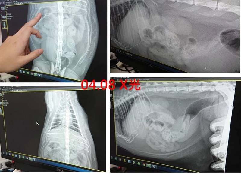 二、X光檢查: 腎臟部位有白影,從另一角度看就沒有白影,懷疑是腸道的物體疊影的關係,若是確定在腎臟內,就可能是結石,如果沒塞住輸尿管,一般不需要做處理,持續觀察就可。