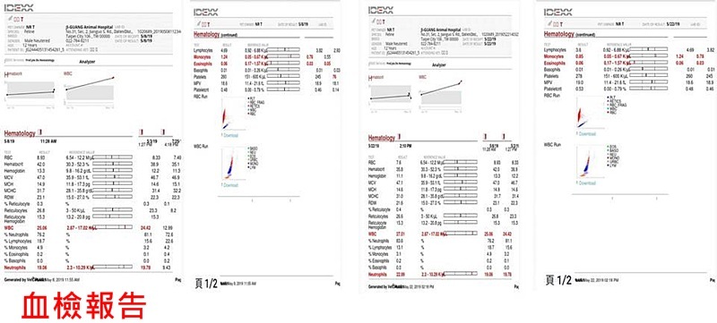 針對白血球升高,林醫師先開口服抗生素,因嗚拉曾在吃藥後嘔吐,抗生素會加進制酸,及因體重減輕加入食促,5日後再回診由蔡仙瑩醫師檢查用藥後有無改善。