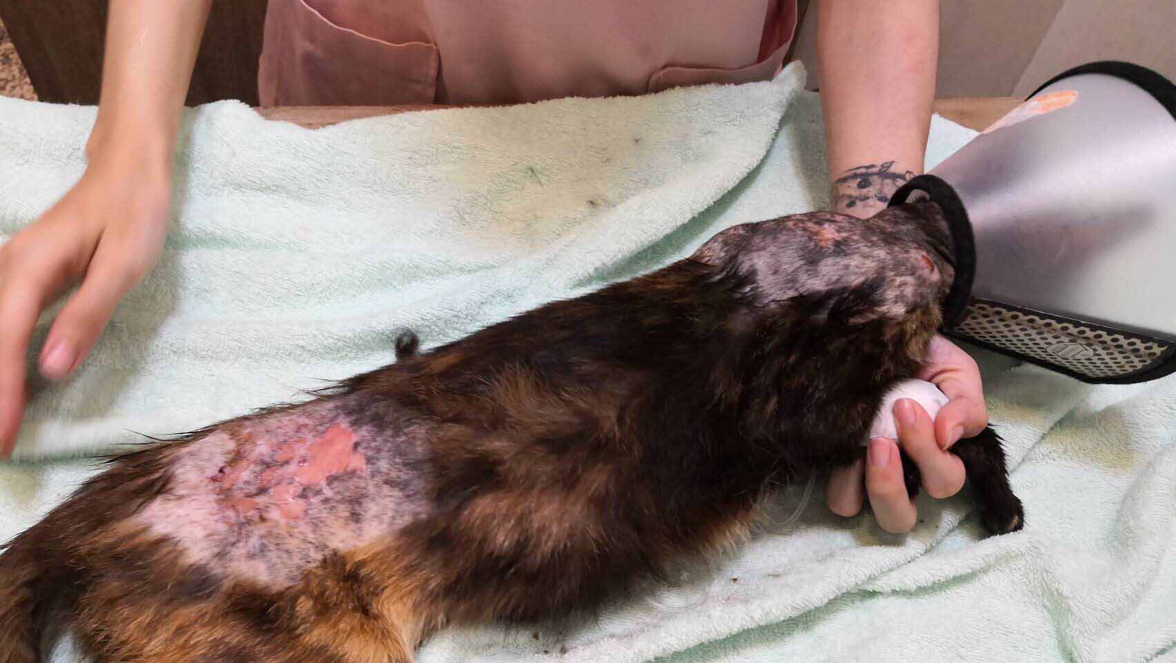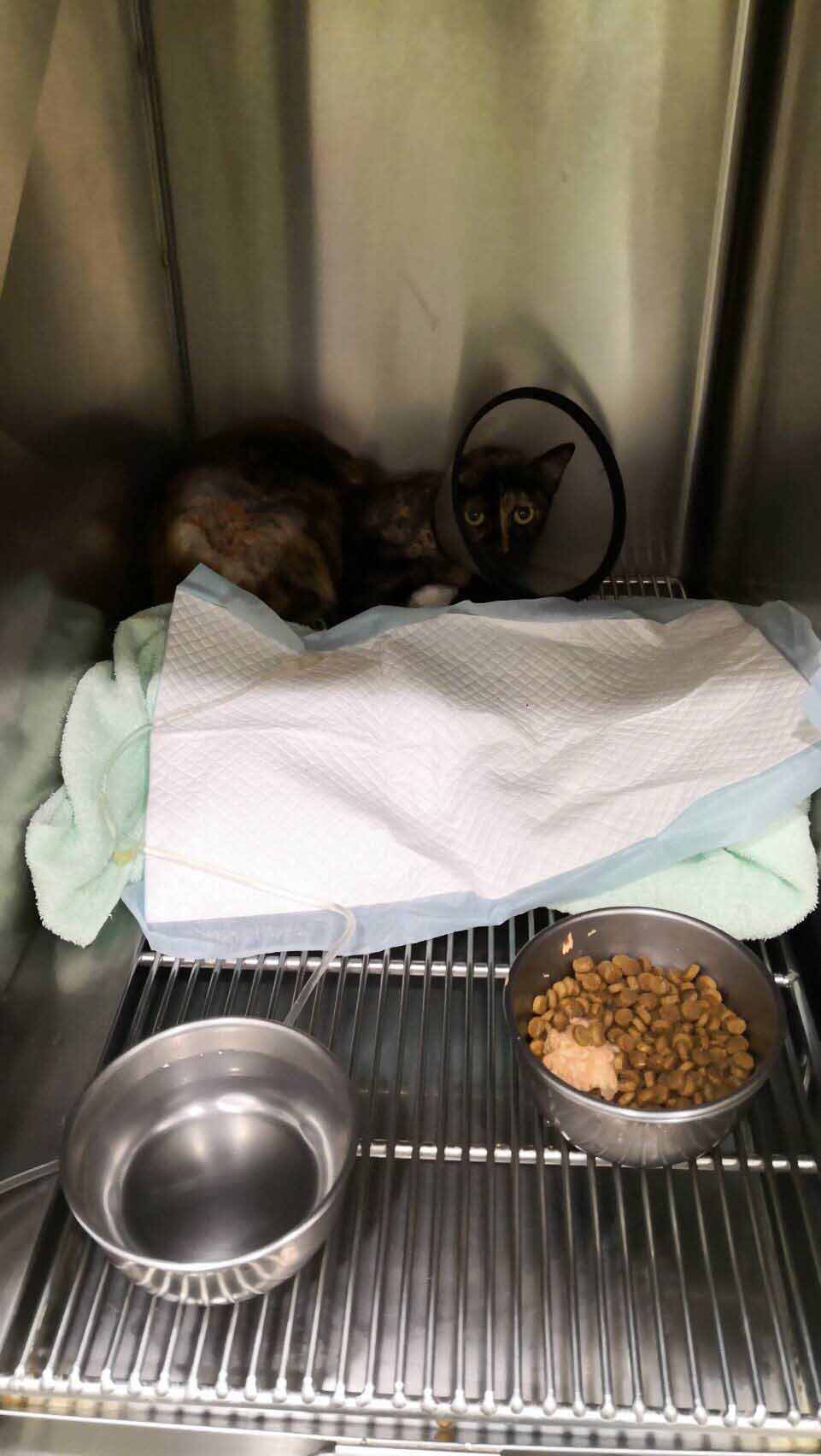 去年一月突然出現在餵養區,當時她很小,瘦巴巴的也很膽小,總是被其他貓咪欺負,因為這些因素,會把她引到邊邊讓她獨自享大快朵頤一番。也許她天生抵抗力較差,很容易有皮膚方面的問題,儘管我每天給她吃保健食品和投藥,一開始效果很好但過了一陣子後皮膚開始潰爛,反覆發作好多次。這一次她突然消失了一個禮拜,好不容易出現了卻瘦到見骨,皮膚也變得更糟,真的很令人心疼,雖然她是浪貓,但她仍有活在這個世界上的權利,希望透過醫療的方式能夠讓她活下去。很感謝協會的醫療資源,讓我可以把她帶去醫院做治療。動物近況說明: 把紫蘇送到醫院後才發現她真的已經瘦到皮包骨了,只剩下2.4公斤了,真恨自己為什麼不能早點抓到她。醫生必須給她適量的麻醉才能局部剃毛,檢查身上到底有多少傷口,看到傷口後我的腦袋空了,頸部大大小小好幾個傷口,有些傷口一直流血和化膿,身體的身口佔了身長的三分之一,我不忍心看下去,因為看了會想哭。這途中紫蘇一直看著我,好像在告訴我她很不舒服很驚恐也很無助,她哀傷的眼神讓我很難過也很自責,如果我早點抓到她,或許不會那麼嚴重。經過抽血檢查才知道她嚴重貧血和營養不良,皮膚潰爛是因為免疫力出了問題,也有可能血液裡有寄生蟲,以上這些讓我很不知所措,我不知道這麼瘦弱的她能不能撐過這一關,只能拜託醫生盡力醫治她。