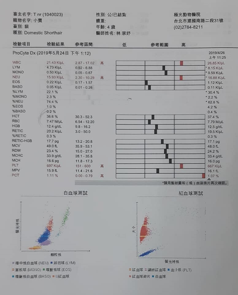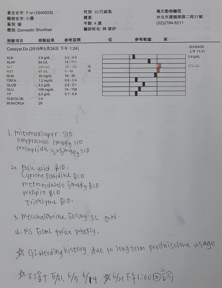 血檢結果,紅白血球指數進步,腎及營養指數持平,但肝指數升高較多,醫師認為可能與停掉皮下輸液有關,因此再打回皮下輸液,另小賓近期包含今早都有嘔吐,用藥也會再加回制酸。