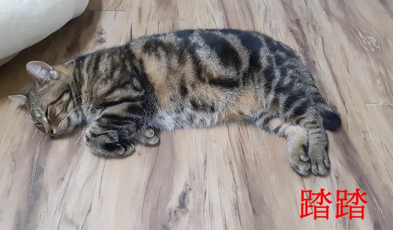 踏踏是協會從收容所救出的可憐被棄養貓咪,原主人因踏踏的癲癇所以棄養她,協會志工看到在收容所籠子內的踏踏一直撒嬌磨蹭,讓人非常心疼,於是便將踏領出至醫院接受治療檢查,協會安排踏踏於103/12/11在台大進行核磁共振攝影檢查以及腦脊髓液採樣分析,結果並無先天上結構異常,也沒有後天的腦部病變,血檢排除了離子不平衡、中毒等狀況,醫師研判應該是不明原因自發性癲癇,有可能是遺傳基因的病變,目前腦部狀況正常,海馬體也沒有萎縮,就是需持續吃抗癲癇藥物及回診追蹤。