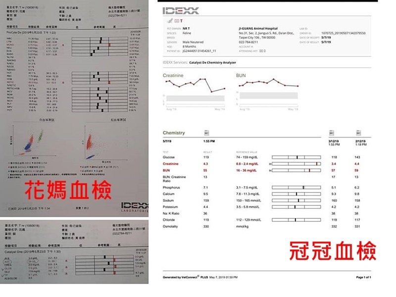 看記錄表飲食、排泄無大礙,所以只驗與腎相關的數值。血檢結果,腎指數cre由3.4變高到4.3、bun由5.5微降至5.3,且磷指數也變高,醫師認為冠冠從以前的指數就比較容易高高低低,因此先改變免疫抑制劑的服用頻率、增加微量輸液量並一個月後回診。