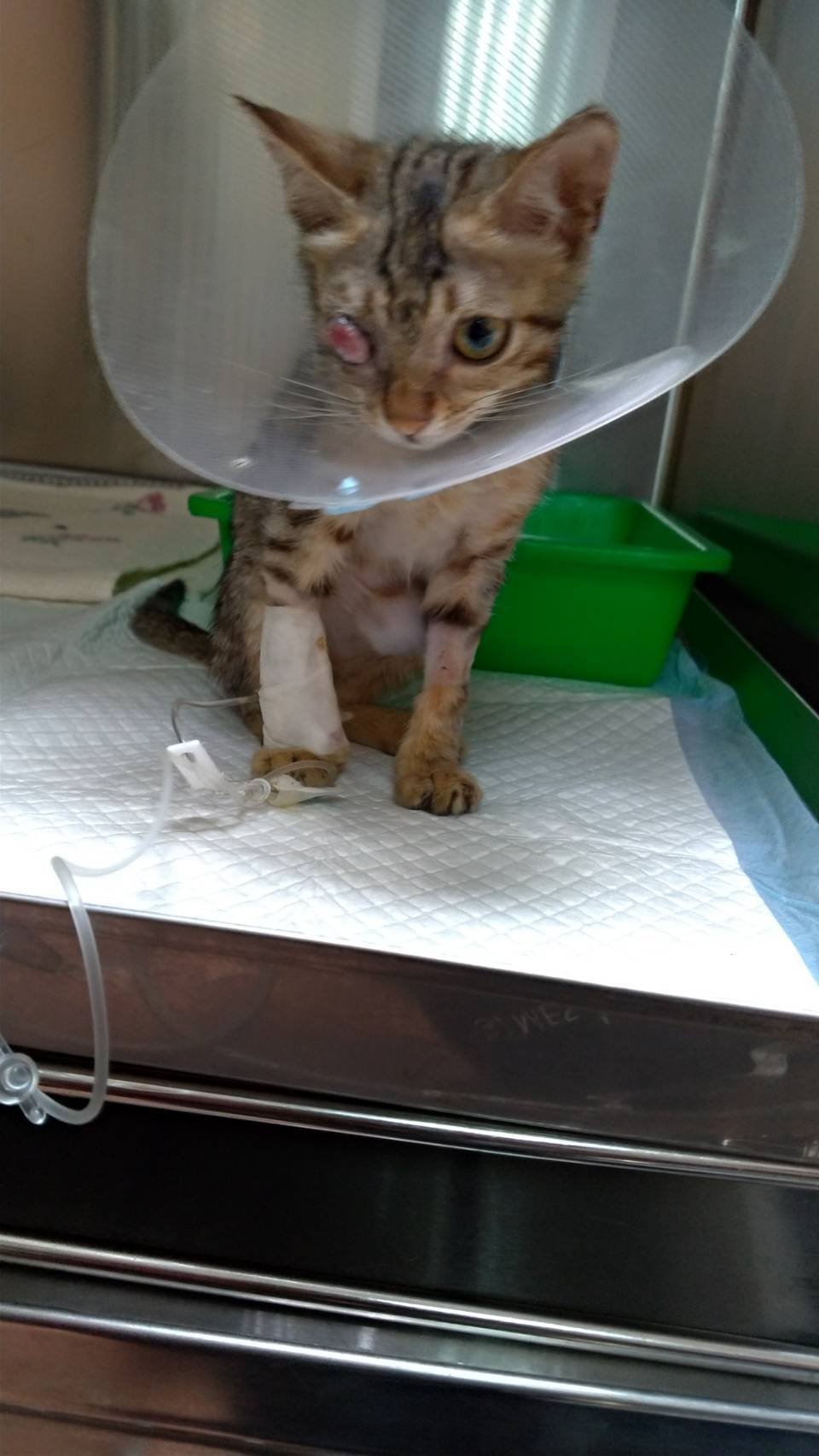 主題: 眼球爆出的小貓-娜娜 申請者姓名: 陳玉映 花色: 申請日期: 2019-07-27 18:45:18 申請者部落格: 申請者臉書網址: 所在縣市/合作醫院: 台北市/極光動物醫院 治療費用: 22248元 需求人數: 50人 已結案 (2024-05-31 18:31:01) 報名人員: Lala x2(已付款)、Bella Chen x3(已付款)、freesia(已付款)、小君(已付款)、Cathy Yang(已付款)、vickysu58 x2(已付款)、wang a liang x2(已付款)、Jeffrey Shih(已付款)、Doris(已付款)、emily8025 x2(已付款)、Penny(已付款)、胡 x2、胡 x2、彷彿是昨天(已付款)、吳安娜 x3(已付款)、Yunhuei(已付款)、Caine x2(已付款)、Tzu Ning Kuo(已付款)、Andy chen(已付款)、蒼蠅叔 x2(已付款)、馨慧(已付款)、薇薇安(已付款)、Heidy(已付款)、厚 x2(已付款)、Pico(已付款)、彷彿是昨天(已付款)、nicole chen(已付款)、nicole chen(已付款)、Ching Yang(已付款)、豆豆 x4(已付款)、meemee x3(已付款)、PJ Chen(已付款)、陳奶油(已付款)、Jasmine Lin(已付款)、Sunny Guan(已付款)、艾米(已付款)、 候補人員: 動物病情說明: 108/6/16那天例行餵貓時、行經全聯附近的一處殘破矮屋下、聽到有小貓發出微弱的哀號、循聲找去、赫然發現一隻右眼明顯突起且腐爛流膿的虎斑小貓對我張望、當時、我心崩潰而紊亂,因小貓狀況危急、不宜久拖、遂於隔天中午找愛爸協助、帶誘捕籠前去捕捉、炎炎夏日下、在小貓性命交關的、緊張而耐心的捕捉過程中、愛爸和我都屏息以待、深恐有所閃失…、皇天不負苦心人、終於抓到小貓,而令人愛憐的小貓也似乎善解人意似的很配合我們的捕捉行動,乖乖地讓我們送往醫院。