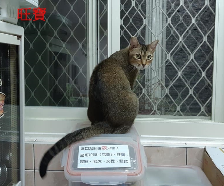 旺寶是在2012年間因居民的通報被抓進了內湖收容所,當時好瘦弱,只有1.7公斤,協會帶出住院治療,旺寶狀況很不好,除了容易嘔吐,還出現了自殘的情況,安排不同醫院檢查,但醫師們都找不出旺寶的身體有什麼問題,研判可能在於心理方面的因素,因此在住進安養之家後,照護員非常用心呵護,也針對容易嘔吐的情況仔細挑選適合她的罐罐,希望讓旺寶感受到滿滿的愛,會有安全與歸屬感,漸漸的旺寶不再有疑似自殘的行為,並會向照護員撒嬌討吃,健康情況逐漸穩定了,模樣也越來越可愛漂亮。