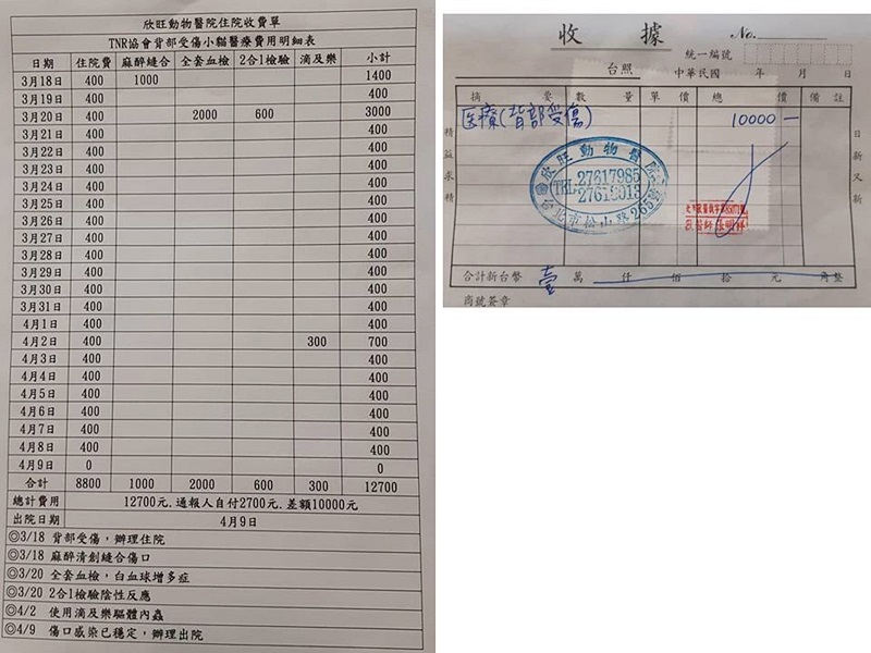 本筆醫助為白底虎斑小貓咪自3月18日至4月19日於欣旺醫院的醫療費用,包含傷口清創縫合、住院、血檢、二合一檢驗、驅虫,希望大家一起幫忙,謝謝大家。