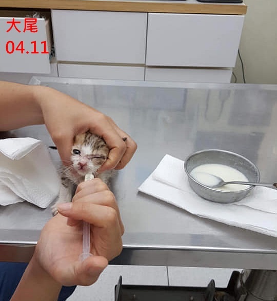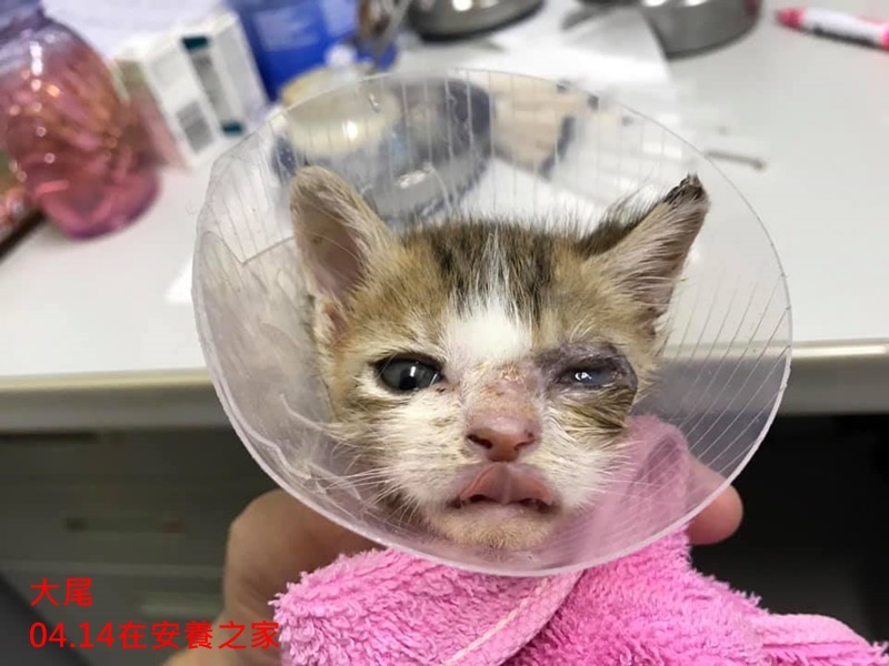 因這隻小貓愛甩尾巴、又希望他變得很大尾,所以取名David,暱稱大尾,大尾的眼睛傷勢不輕、加上太過年幼虛弱,往後還須一段時間的醫療,本筆醫助是協會於4月16日將大尾自收容所接出後先送往欣旺醫院檢查的費用,包含用藥,