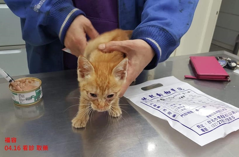 福容是志工劉秀珍救援的小貓,除了有蛔虫須驅體內虫之外,因眼睛紅腫爭不開,檢查後是皰疹病毒感染所致,須吃藥及點眼藥水。