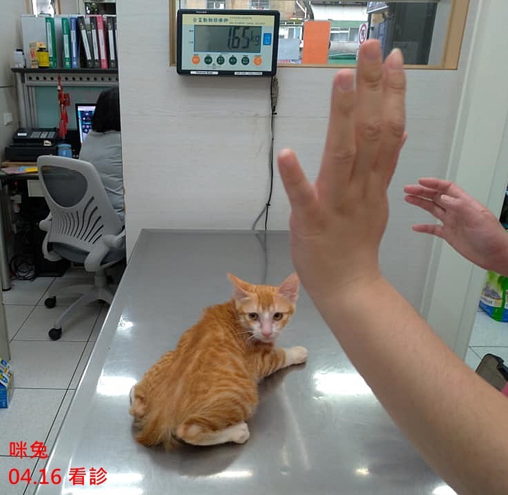 咪兔是此次工作人員執行完TNR的原放任務時,正要往洗手間走去,卻發現有一隻小橘貓左後腳受傷了,趕緊第一時間誘捕送醫。