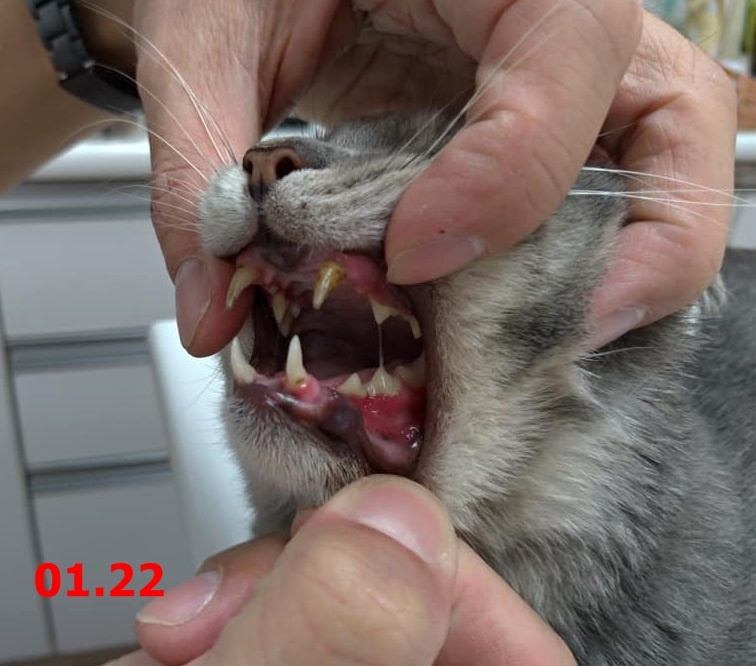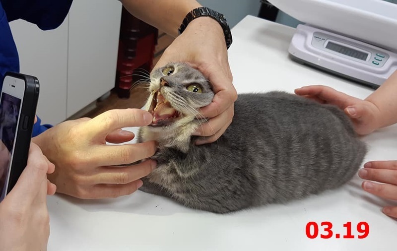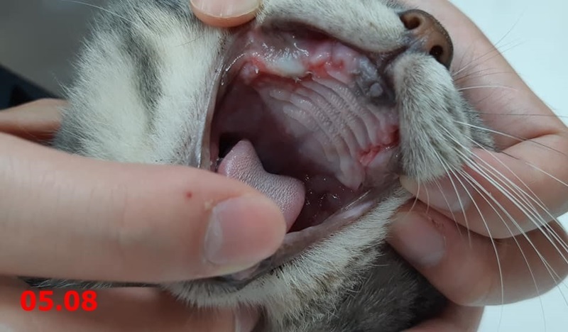 口腔檢查,左側下方牙齦紅腫潰瘍,有些流血,口腔後方也有紅腫,是嚴重牙齦炎伴隨口炎,前次回診林院長懷疑小香有齒吸收疾病,但這需要拍攝齒科X光才能確診,目前先以內科處理,吃抗生素、類固醇及止痛滴劑治療二週,如果未改善再討論以外科進行牙周手術。