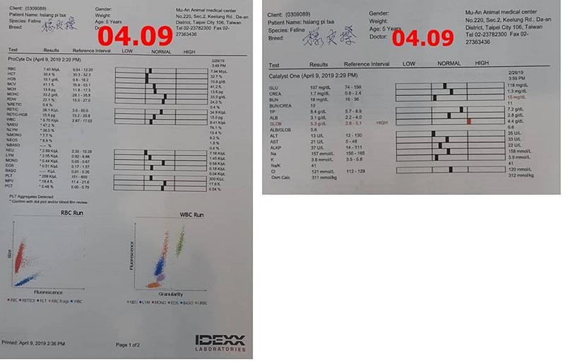 血檢結果發炎蛋白升高一些,口腔檢查,前方犬齒牙齦紅腫狀況有消退一點,但後方牙齦仍較紅。黴菌藥先暫停一週,4/30 再開始吃。