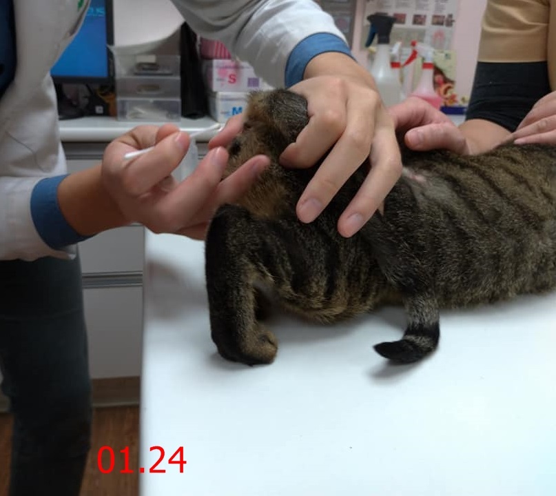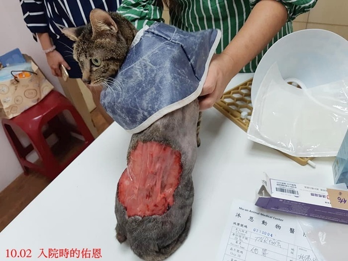 發現者先將她送去醫院進行縫合,但後續無法安置,於是上網找到一位中途可以幫忙,沒想到傷口縫合又裂開,造成更大的開放性傷口,加上照顧期間貓咪可能因掙脫頭套舔傷口,致傷口擴大,加上營養不良(中途提供素食),再次送醫治療月餘也不見好轉,高雄志工與貓友不忍心貓咪狀況惡化,於今年9月底尋求協會幫助,10月2日由一位好心小姐協助帶佑恩北上至協會配合的沐恩醫院進行治療。