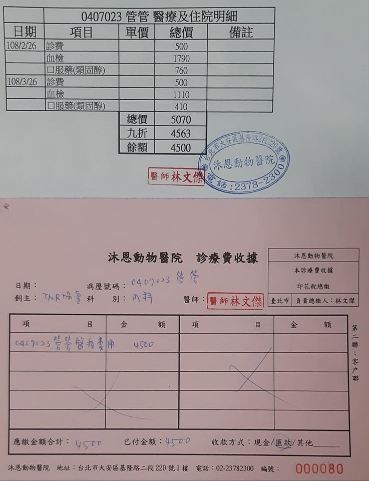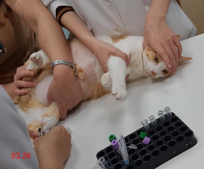 施打干擾素計畫半年來,管管的口炎有明顯的進步,口腔的紅腫已消退不少,已經可以逐漸拉長回診間隔,嘴巴的不適消失了,讓管管看來開心很多,管管個性非常親人,經常繞著人討摸摸,讓人十分喜愛,雖然健康情況變好,但管管還須長期的醫療與用藥,本筆醫助為管管自2019年2月26日、2019年3月26日的回診費用,包含檢驗及用藥,希望大家可以一起幫忙,萬分感恩。