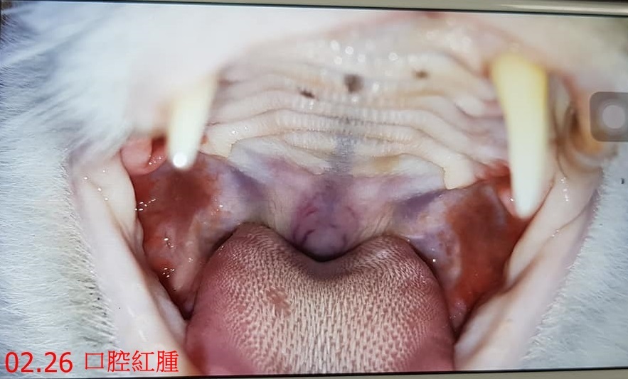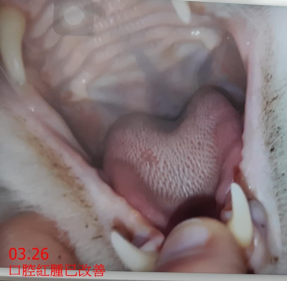 口腔部份目視與上次相較,紅腫現象有比較好,但貧血指數有再掉一些,血檢GLOB發炎指數有進步,因管管的體重有略增,大致上應該還好。請照護員留意管管的食慾、精神活力等,有無流口水、異常撥嘴巴、舔嘴動作,再記錄於照護文。