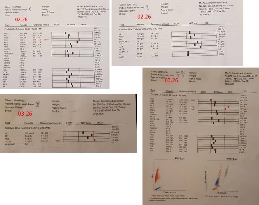紅血球指數下降、發炎蛋白升高,但都是在正常值邊緣,且體重又增加,醫師認為這樣就不需太擔心,應仍是干擾素的影響,少數貓咪施打干擾素會使紅血球較不穩定。