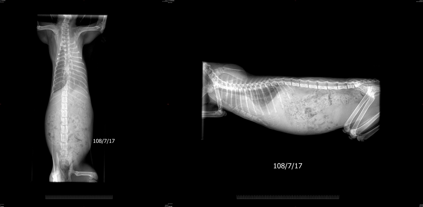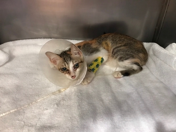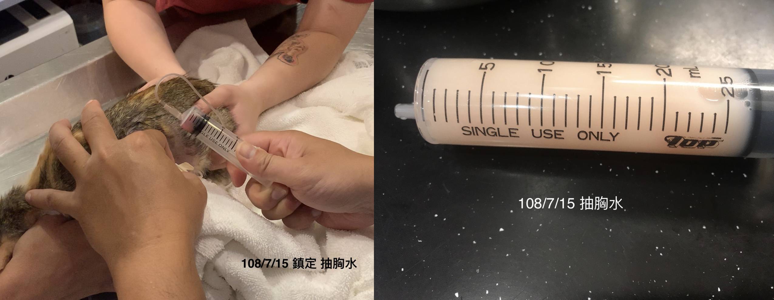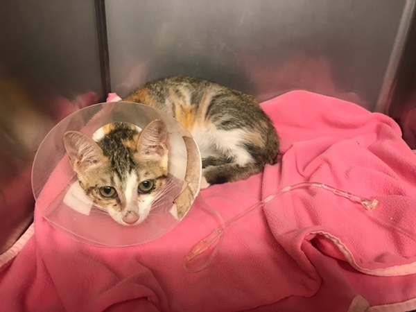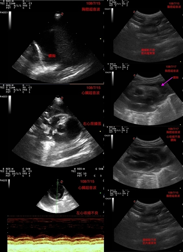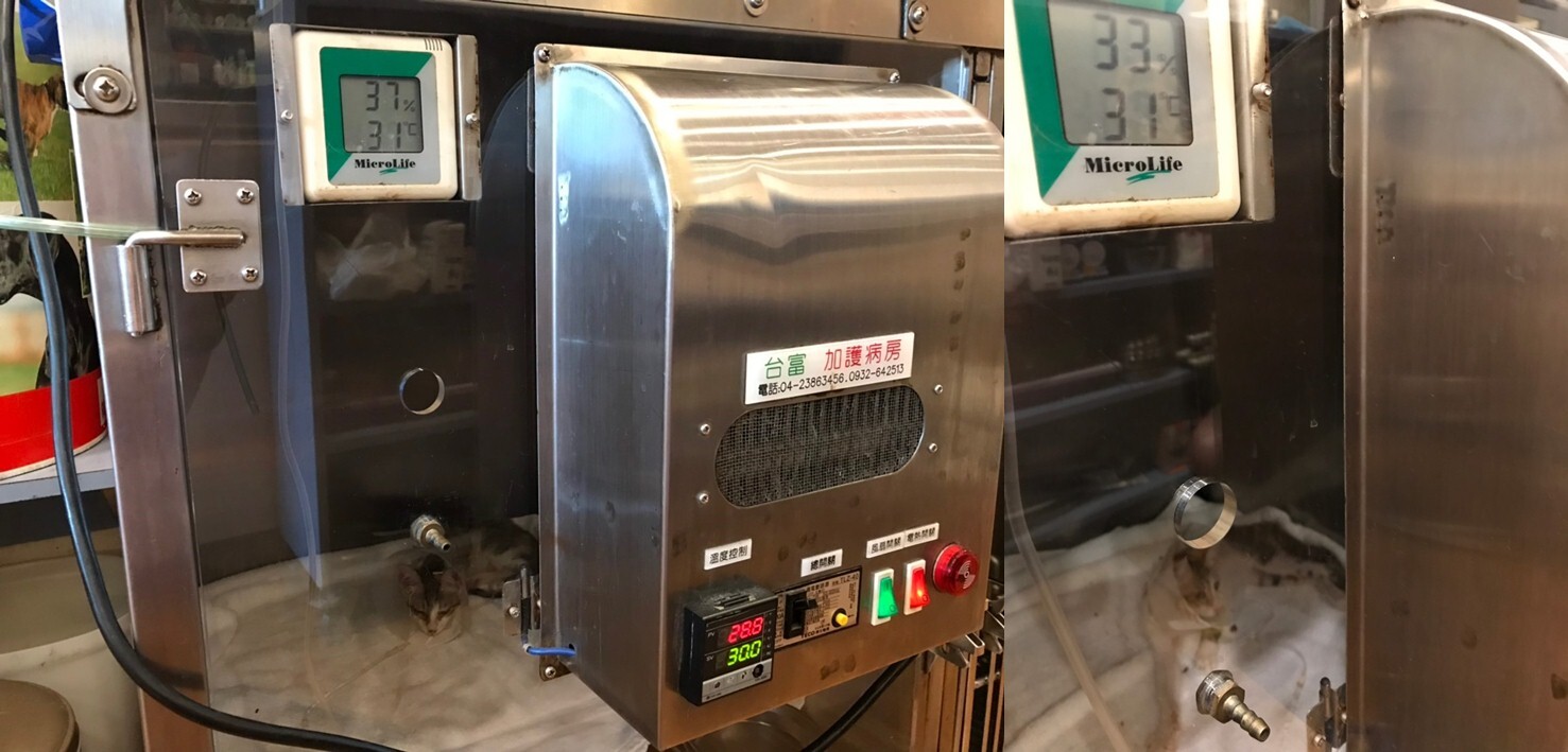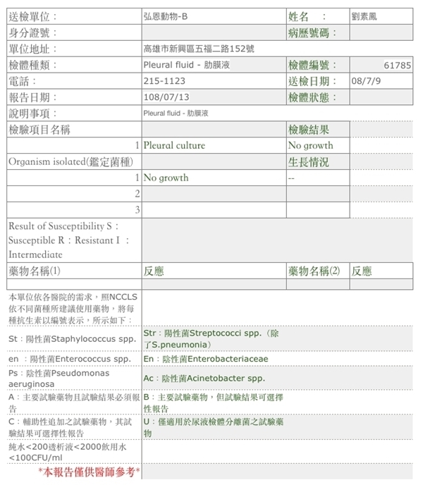 送往醫院檢查與治療, 貓咪送到醫院檢查, 照了腹腔超音波, 有腸蠕動不良, 肌肉層異常. 左心收縮不良, 發現有膿胸敗血與感染, 到院後趕緊幫貓咪處理, 有幫他抽胸水, 還有血檢, 陸續治療照顧貓咪恢復得很好, 後來感染也都控制下來, 但還有一些貧血, 醫生也幫他打造血針和鐵劑.動物近況說明: 在醫院精密的儀器和細心的照顧下, 讓小花從死神的手裡逃出, 出院後安置照顧, 目前有找到願意照顧小花一輩子的人, 感謝大家幫助這隻貓咪的醫療.